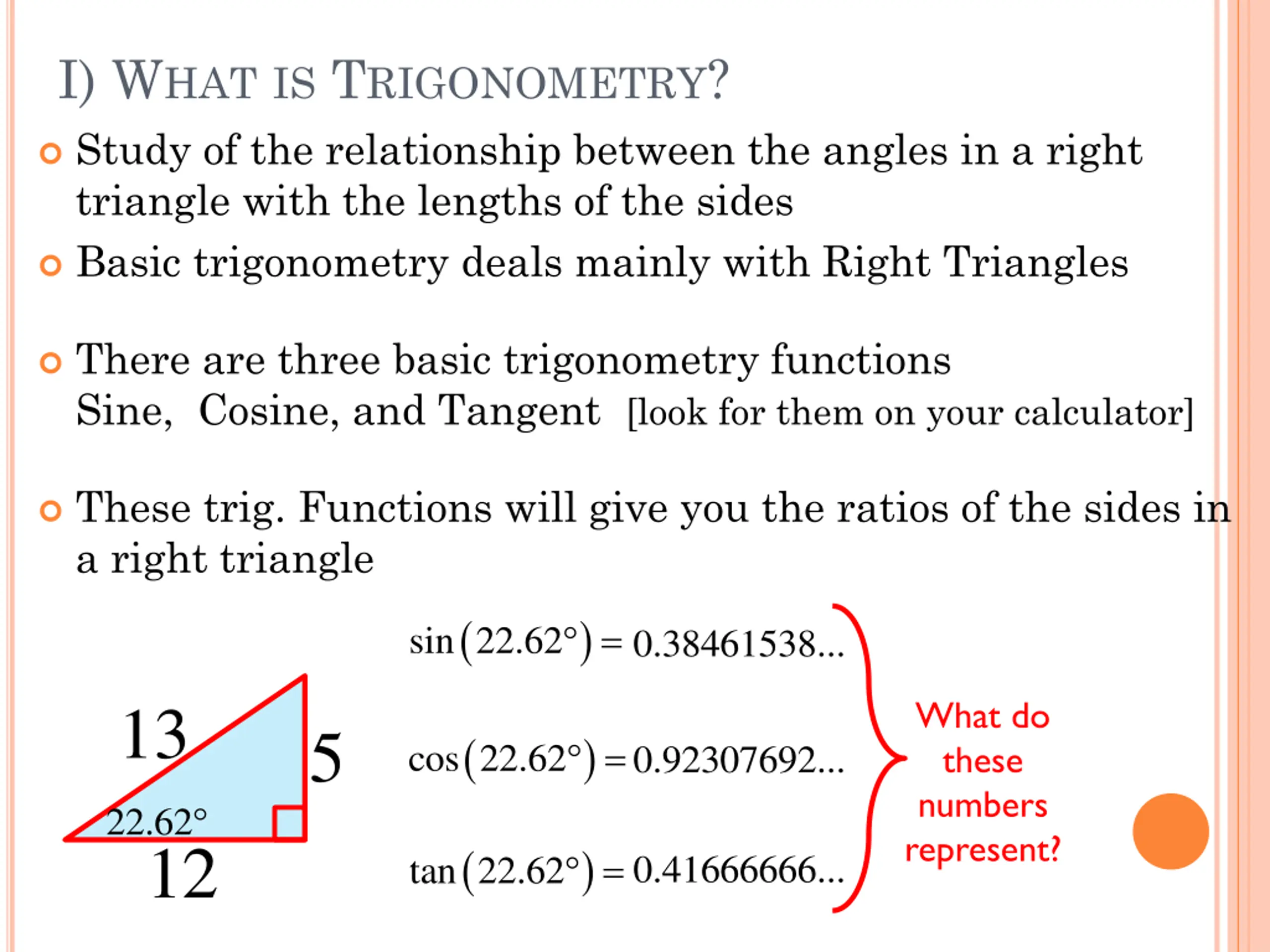 I) WHAT IS TRIGONOMETRY? Study of the relationship between the angles in a right triangle with the lengths of the sides Basic trigonometry deals mainly with Right Triangles There are three basic trigonometry functions Sine, Cosine, and Tangent [look for them on your calculator] These trig. Functions will give you the ratios of the sides in a right triangle ( ) sin 22.62 = 0.38461538... 13 What do these numbers represent? 5 ( ) cos 22.62 =0.92307692... 22.62 12 ( ) tan 22.62 = 0.41666666...