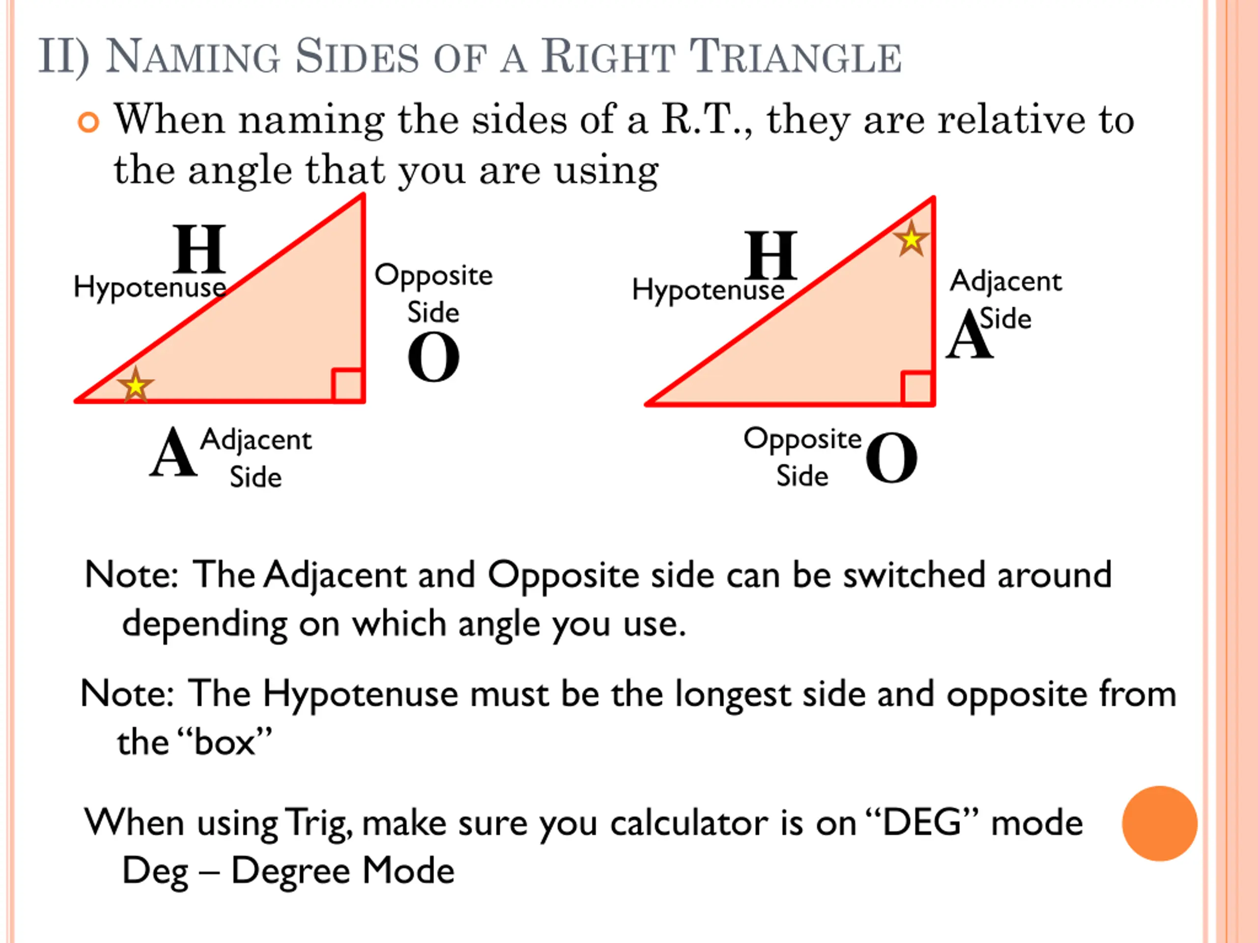 II) NAMING SIDESOFA RIGHT TRIANGLE When naming the sides of a R.T., they are relative to the angle that you are using H H Opposite Side O Adjacent Side A Hypotenuse Hypotenuse Adjacent Side A O Opposite Side Note: The Adjacent and Opposite side can be switched around depending on which angle you use. Note: The Hypotenuse must be the longest side and opposite from the box When using Trig, make sure you calculator is on DEG mode Deg Degree Mode