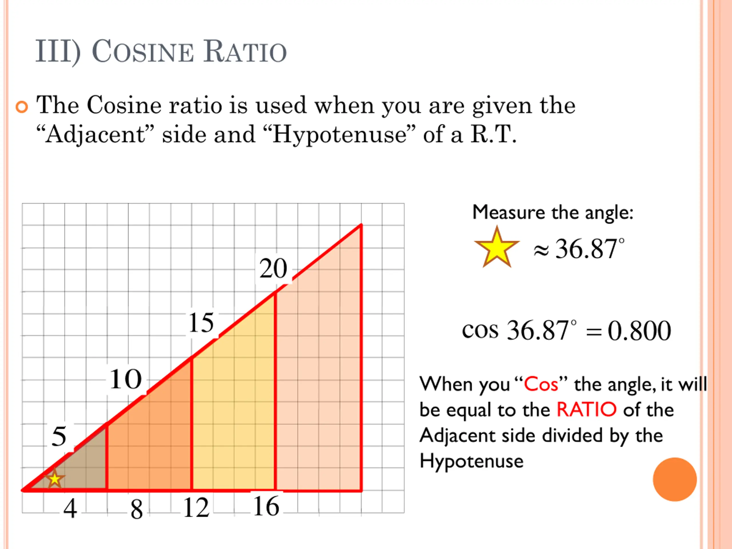 III) COSINE RATIO The Cosine ratio is used when you are given the Adjacent side and Hypotenuse of a R.T. Measure the angle: 36.87 20 15 36.87 = cos 0.800 10 When you Cos the angle, it will be equal to the RATIO of the Adjacent side divided by the Hypotenuse 5 16 12 4 8