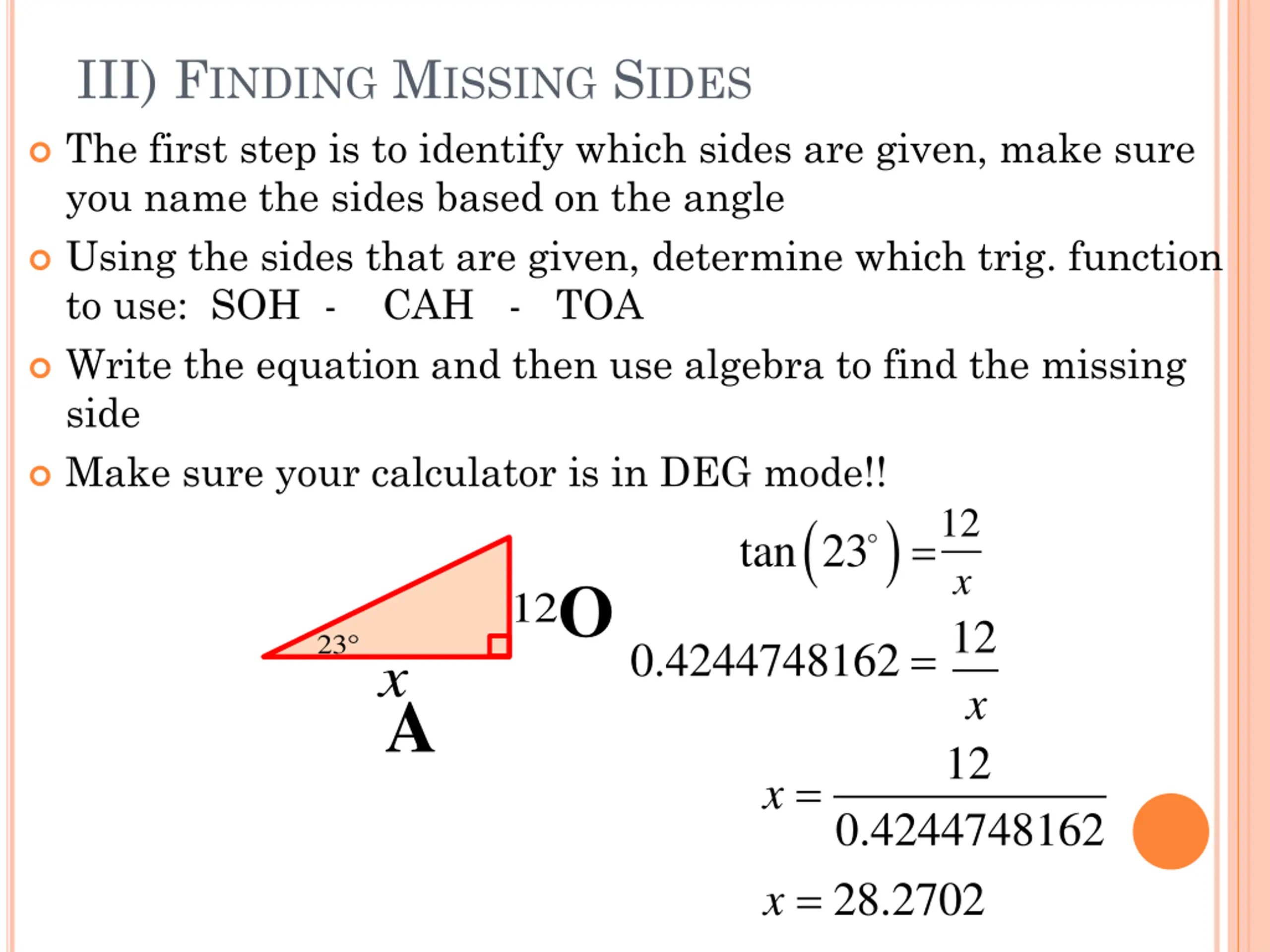 III) FINDING MISSING SIDES The first step is to identify which sides are given, make sure you name the sides based on the angle Using the sides that are given, determine which trig. function to use: SOH - CAH - TOA Write the equation and then use algebra to find the missing side Make sure your calculator is in DEG mode!! ( ) =12 tan 23 x O 12 0.4244748162 =12 23 x A x 12 x = 0.4244748162 28.2702 x =