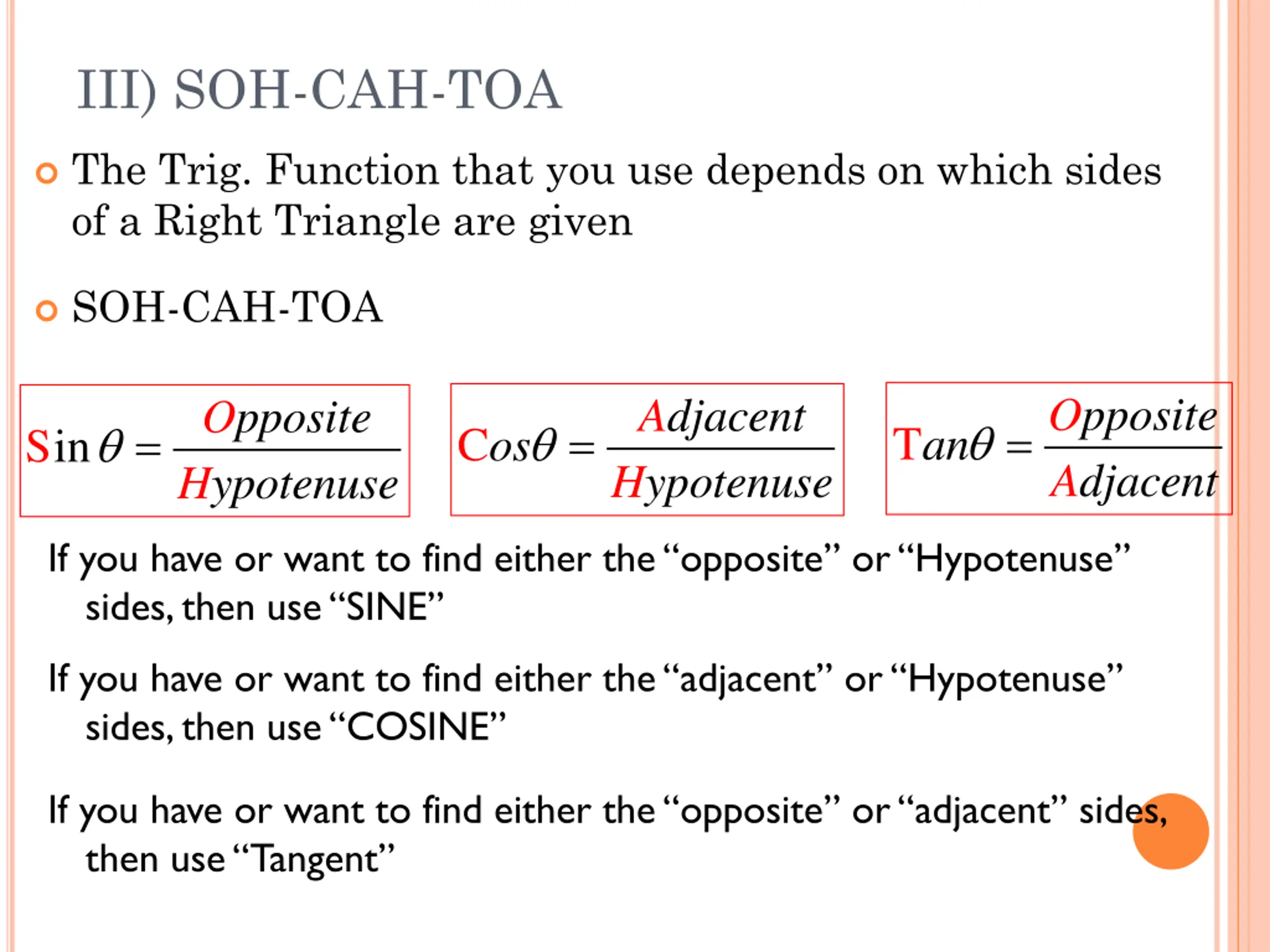 III) SOH-CAH-TOA The Trig. Function that you use depends on which sides of a Right Triangle are given SOH-CAH-TOA pposi O A djacent te djacent ypote H A pposite ypote H O = = = T an C os Sin nuse nu s e If you have or want to find either the opposite or Hypotenuse sides, then use SINE If you have or want to find either the adjacent or Hypotenuse sides, then use COSINE If you have or want to find either the opposite or adjacent sides, then use Tangent