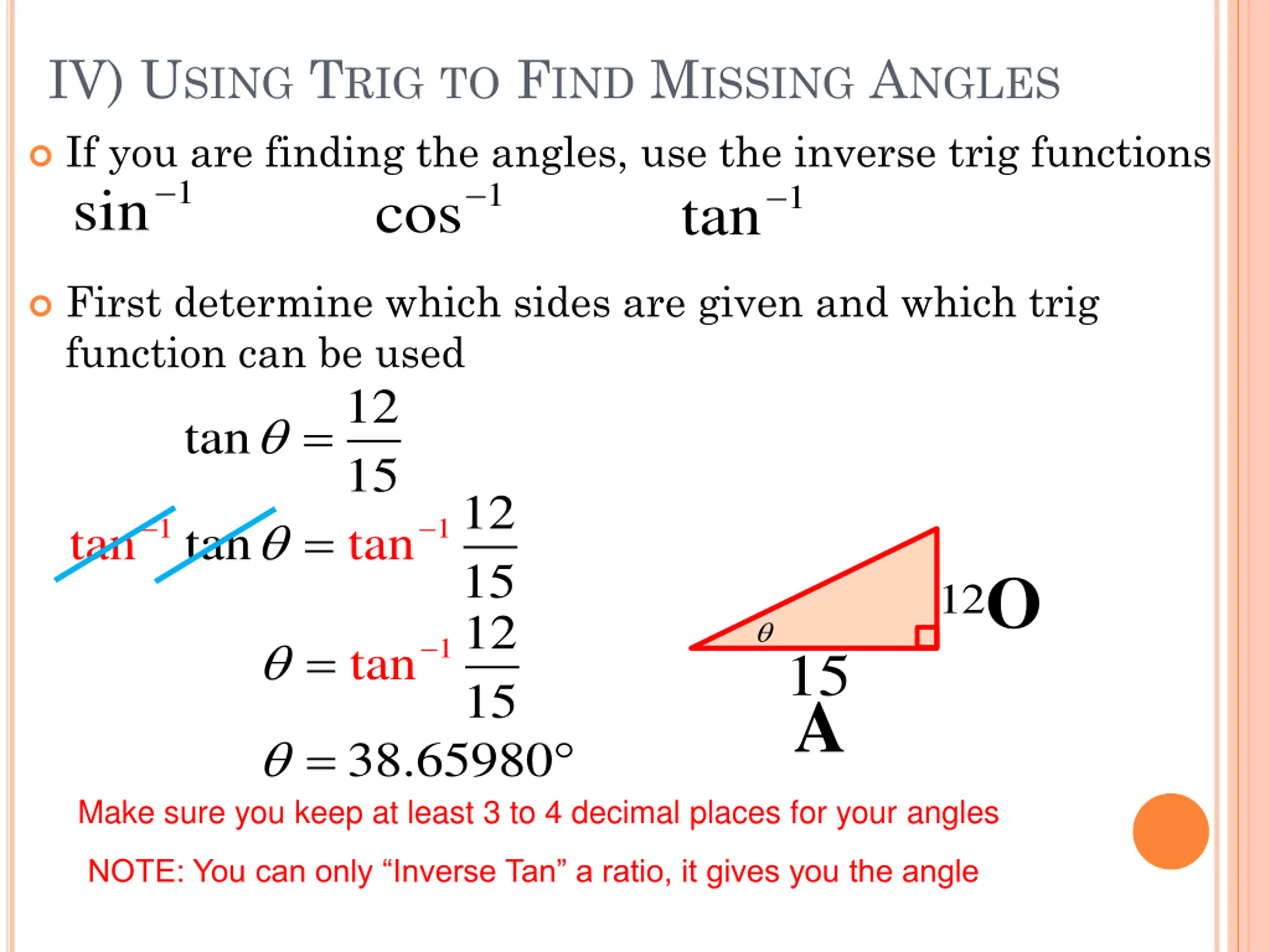 IV) USING TRIGTO FIND MISSING ANGLES If you are finding the angles, use the inverse trig functions 1 sin cos tan 1 1 First determine which sides are given and which trig function can be used 12 tan 15 1 1 tan tan tan 15 12 15 38.65980 = Make sure you keep at least 3 to 4 decimal places for your angles = 12 = O 12 = 1 tan 15 A NOTE: You can only Inverse Tan a ratio, it gives you the angle