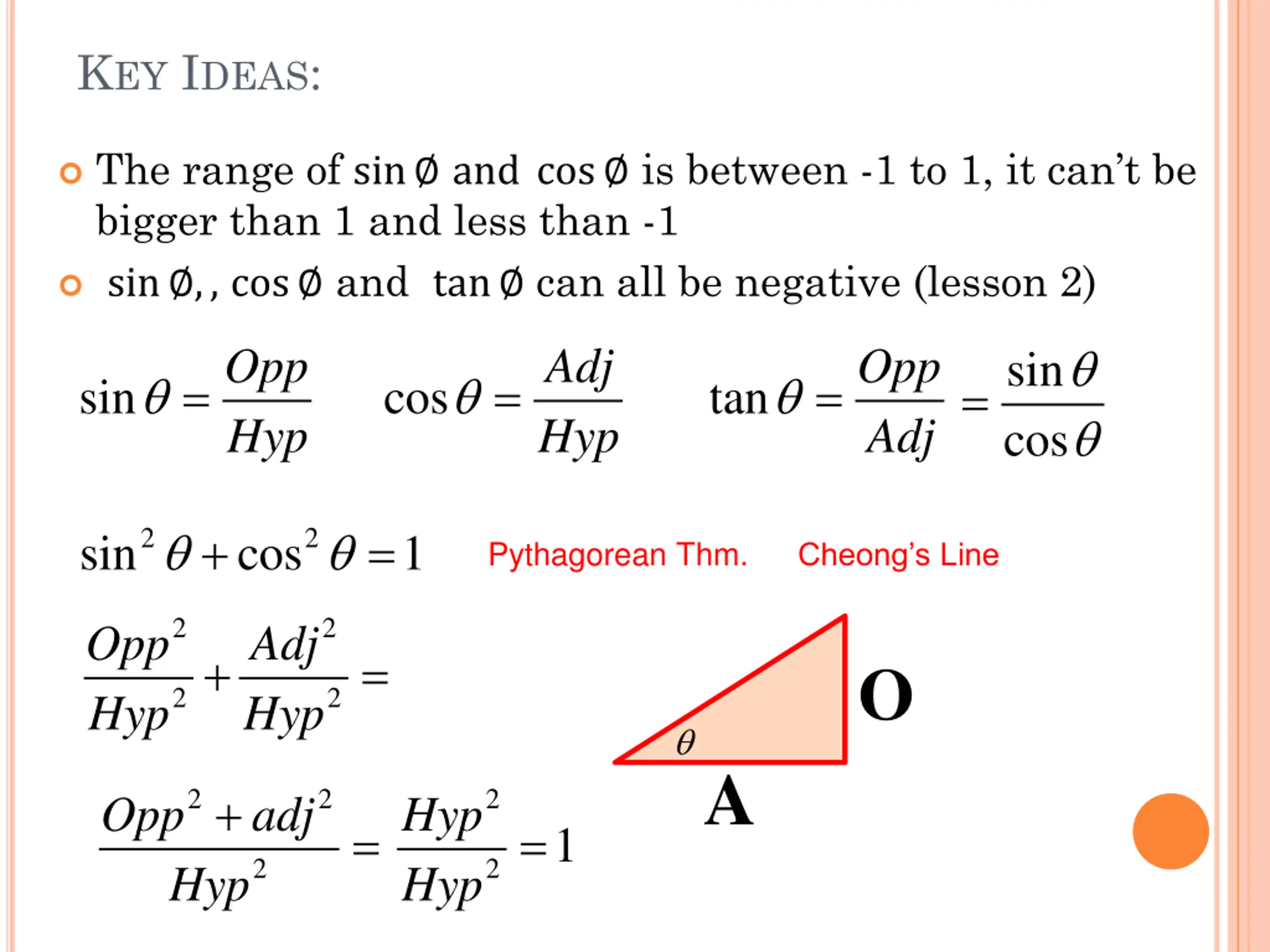 KEY IDEAS: The range of sin and cos is between -1 to 1, it can t be bigger than 1 and less than -1 sin ,,cos and tan can all be negative (lesson 2) Opp Hyp Adj Hyp Opp Adj sin cos = = = = sin cos tan + = 2 2 sin cos 1 Pythagorean Thm. Cheong s Line 2 2 Opp Hyp Adj Hyp + = O 2 2 A + 2 2 2 Opp adj Hyp Hyp = = 1 2 2 Hyp