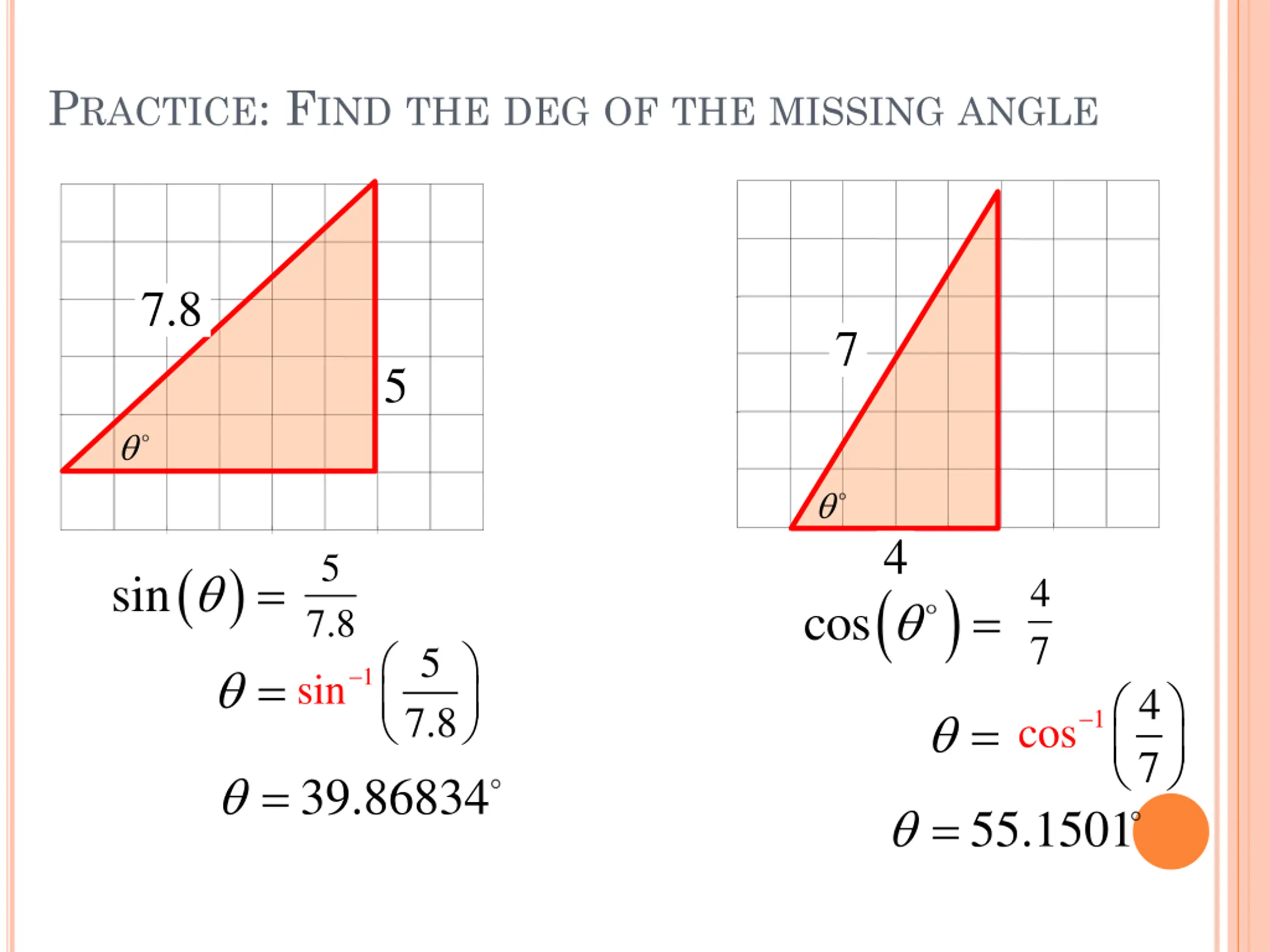 PRACTICE: FINDTHEDEGOFTHEMISSINGANGLE 7.8 7 5 4 ( ) 5 ( ) sin = 4 7 cos = 7.8 sin 5 = 1 cos 1 4 7.8 = 7 = 39.86834 = 55.1501