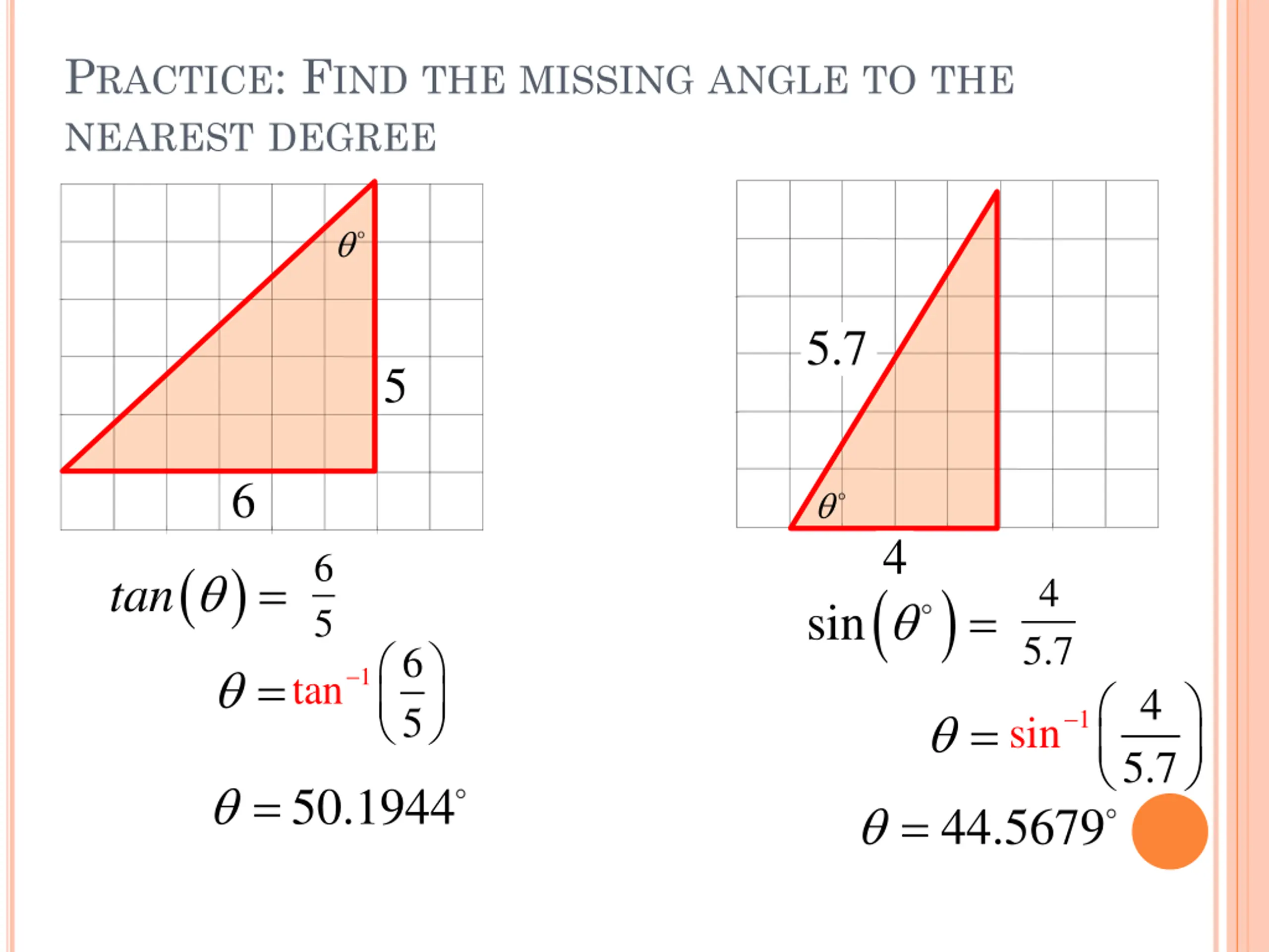 PRACTICE: FINDTHEMISSINGANGLETOTHE NEARESTDEGREE 5.7 5 6 4 ( ) 6 5 ( ) tan = 4 sin = 5.7 sin tan 1 6 = 4 5 = 1 5.7 = 50.1944 = 44.5679