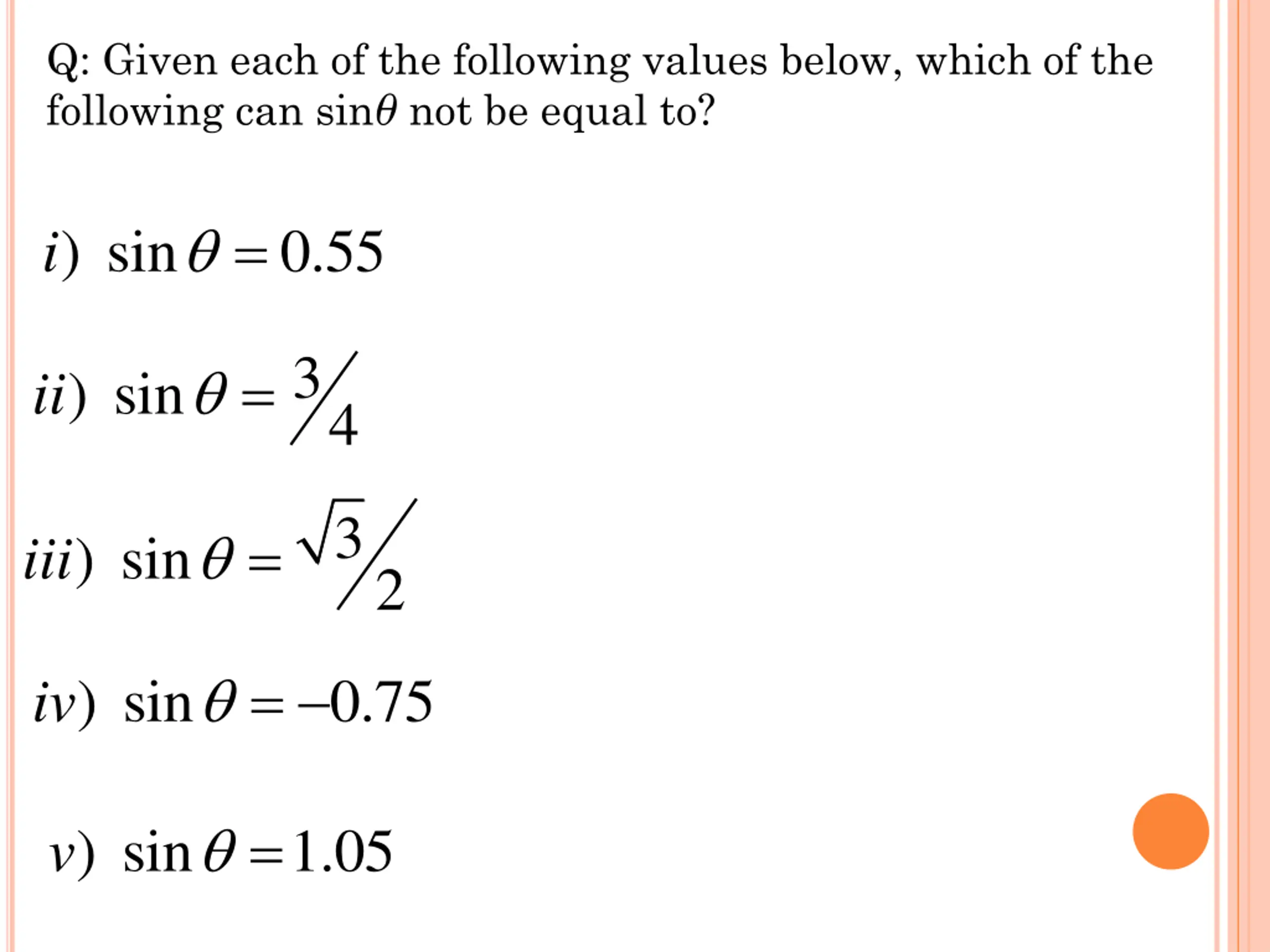 Q: Given each of the following values below, which of the following can sin not be equal to? = ) sin 0.55 i 3 = ) sin ii 4 3 = ) sin iii 2 = ) sin 0.75 iv = ) sin 1.05 v