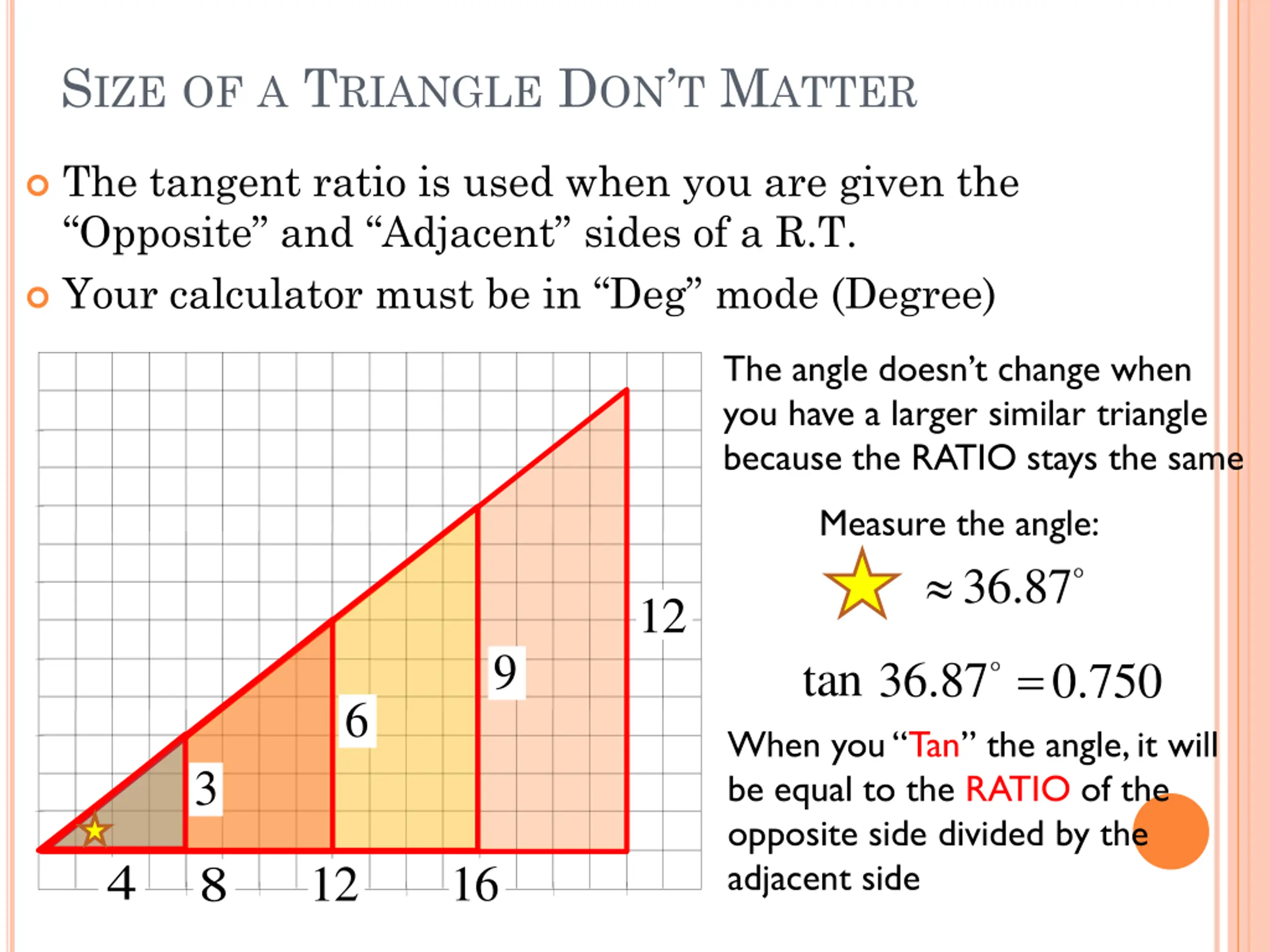 SIZEOFA TRIANGLE DONT MATTER The tangent ratio is used when you are given the Opposite and Adjacent sides of a R.T. Your calculator must be in Deg mode (Degree) The angle doesn t change when you have a larger similar triangle because the RATIO stays the same Measure the angle: 36.87 12 9 36.87 = tan 0.750 6 When you Tan the angle, it will be equal to the RATIO of the opposite side divided by the adjacent side 3 4 16 12 8