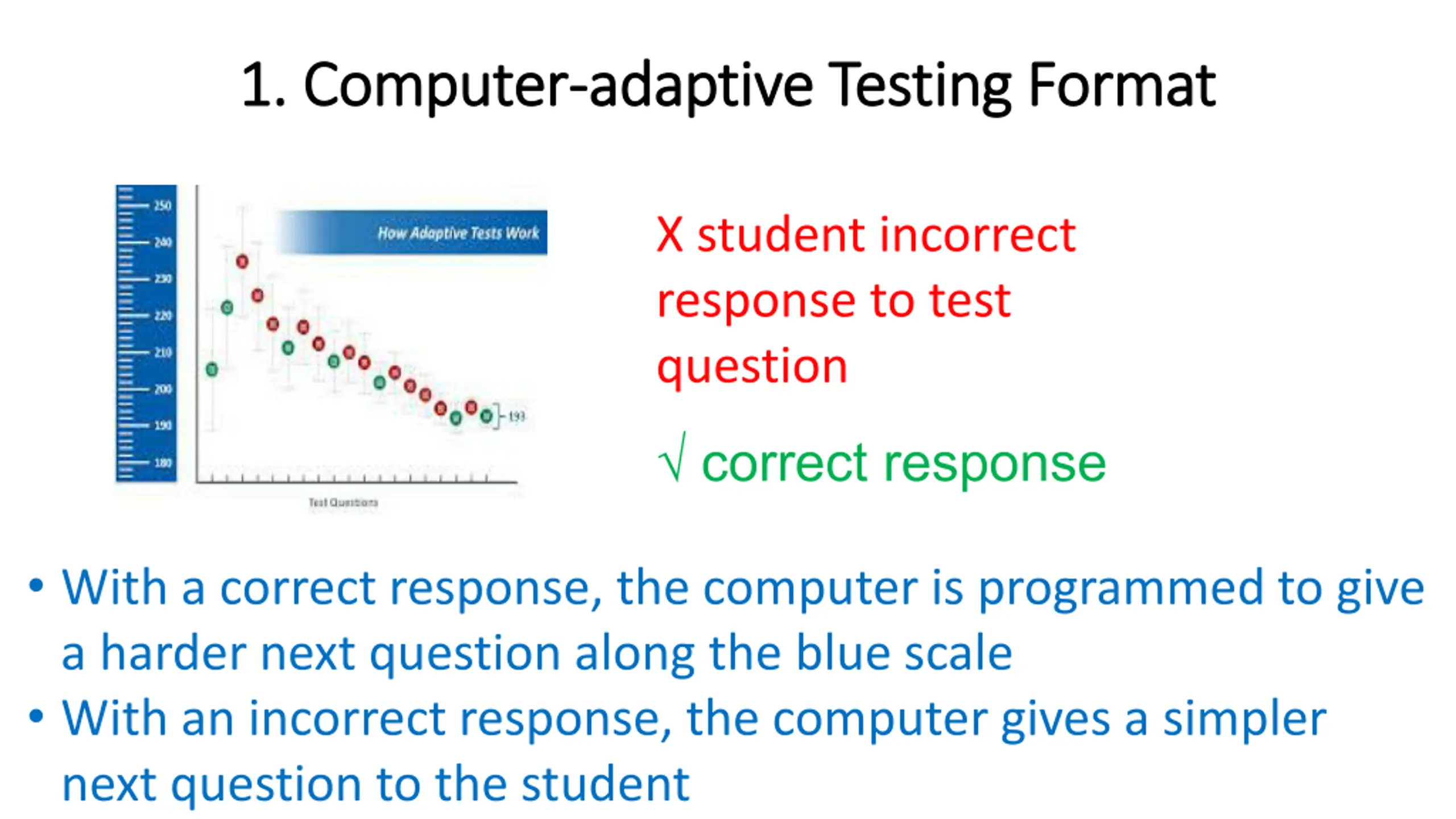 1. Computer 1. Computer- -adaptive Testing Format adaptive Testing Format X student incorrect response to test question correct response With a correct response, the computer is programmed to give a harder next question along the blue scale With an incorrect response, the computer gives a simpler next question to the student