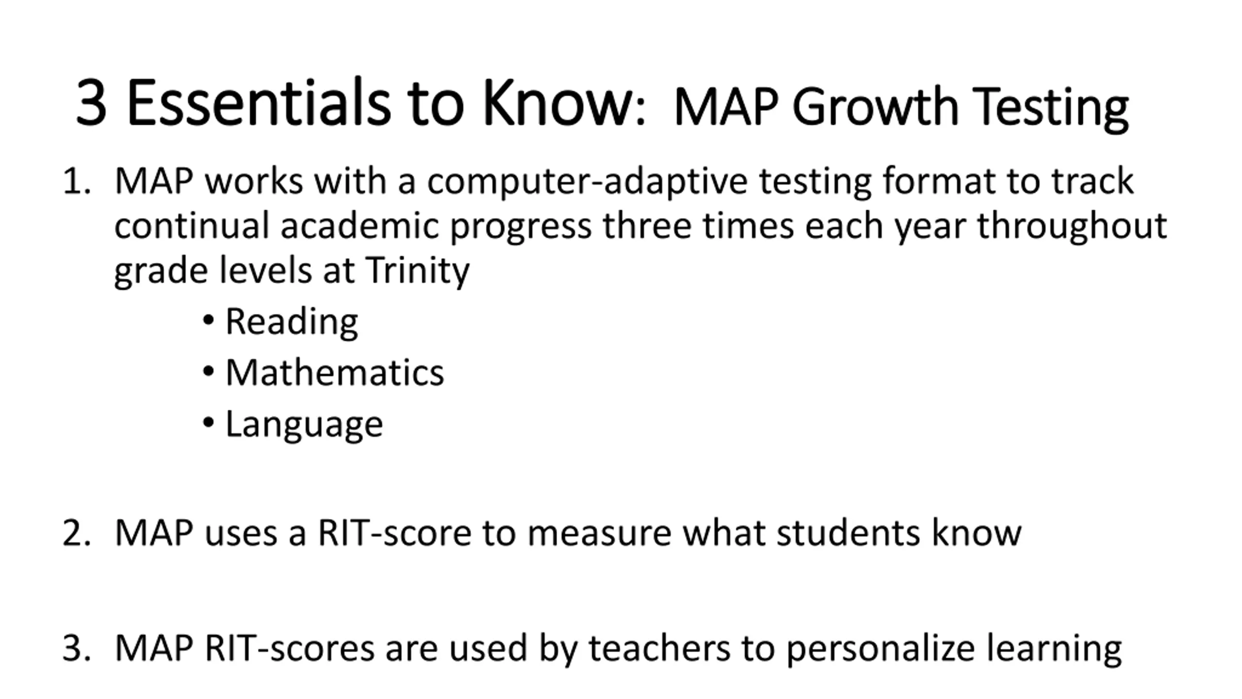3 Essentials to Know 3 Essentials to Know: MAP Growth Testing : MAP Growth Testing 1. MAP works with a computer-adaptive testing format to track continual academic progress three times each year throughout grade levels at Trinity Reading Mathematics Language 2. MAP uses a RIT-score to measure what students know 3. MAP RIT-scores are used by teachers to personalize learning
