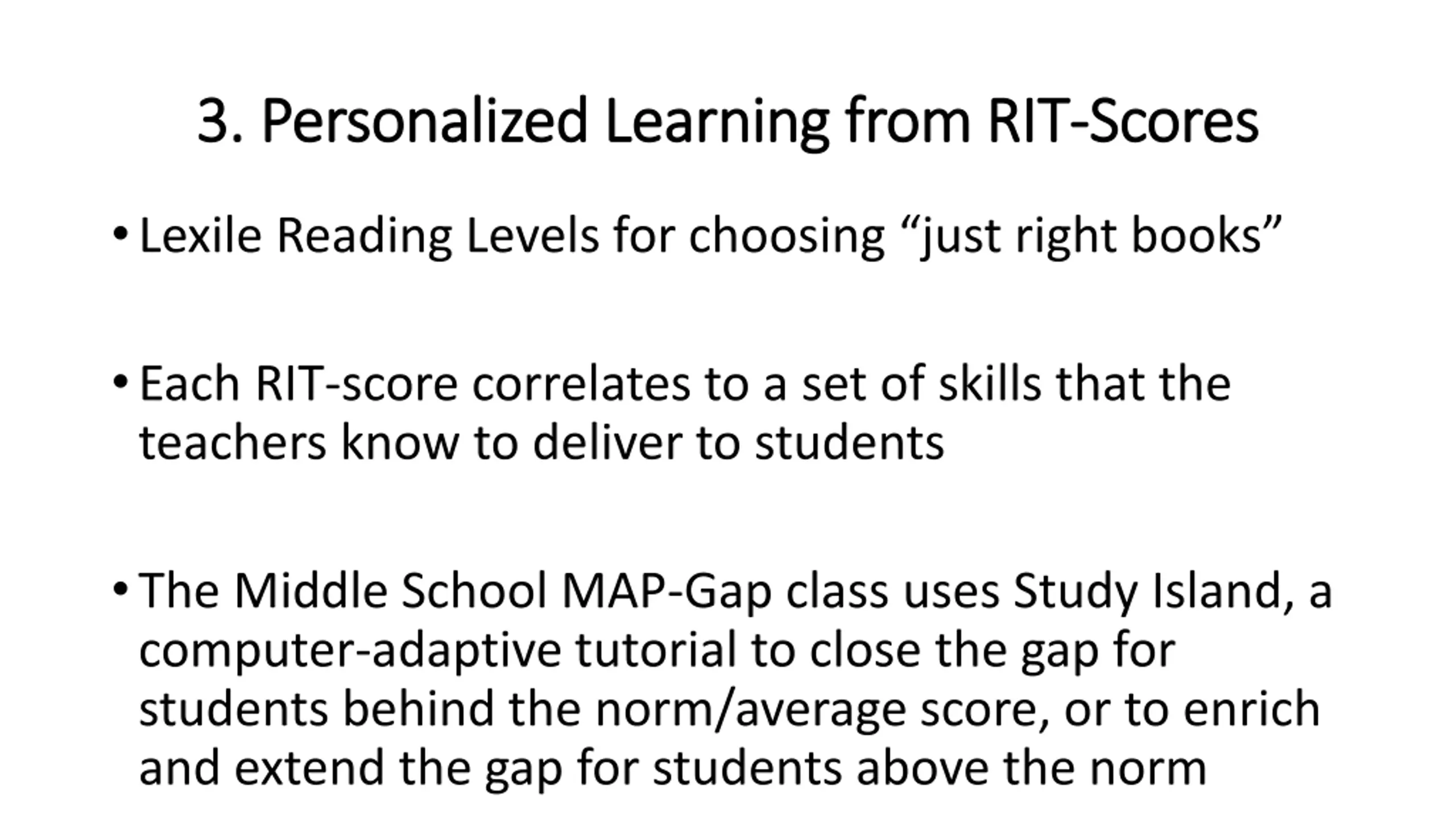 3. Personalized Learning from RIT 3. Personalized Learning from RIT- -Scores Scores Lexile Reading Levels for choosing just right books Each RIT-score correlates to a set of skills that the teachers know to deliver to students The Middle School MAP-Gap class uses Study Island, a computer-adaptive tutorial to close the gap for students behind the norm/average score, or to enrich and extend the gap for students above the norm