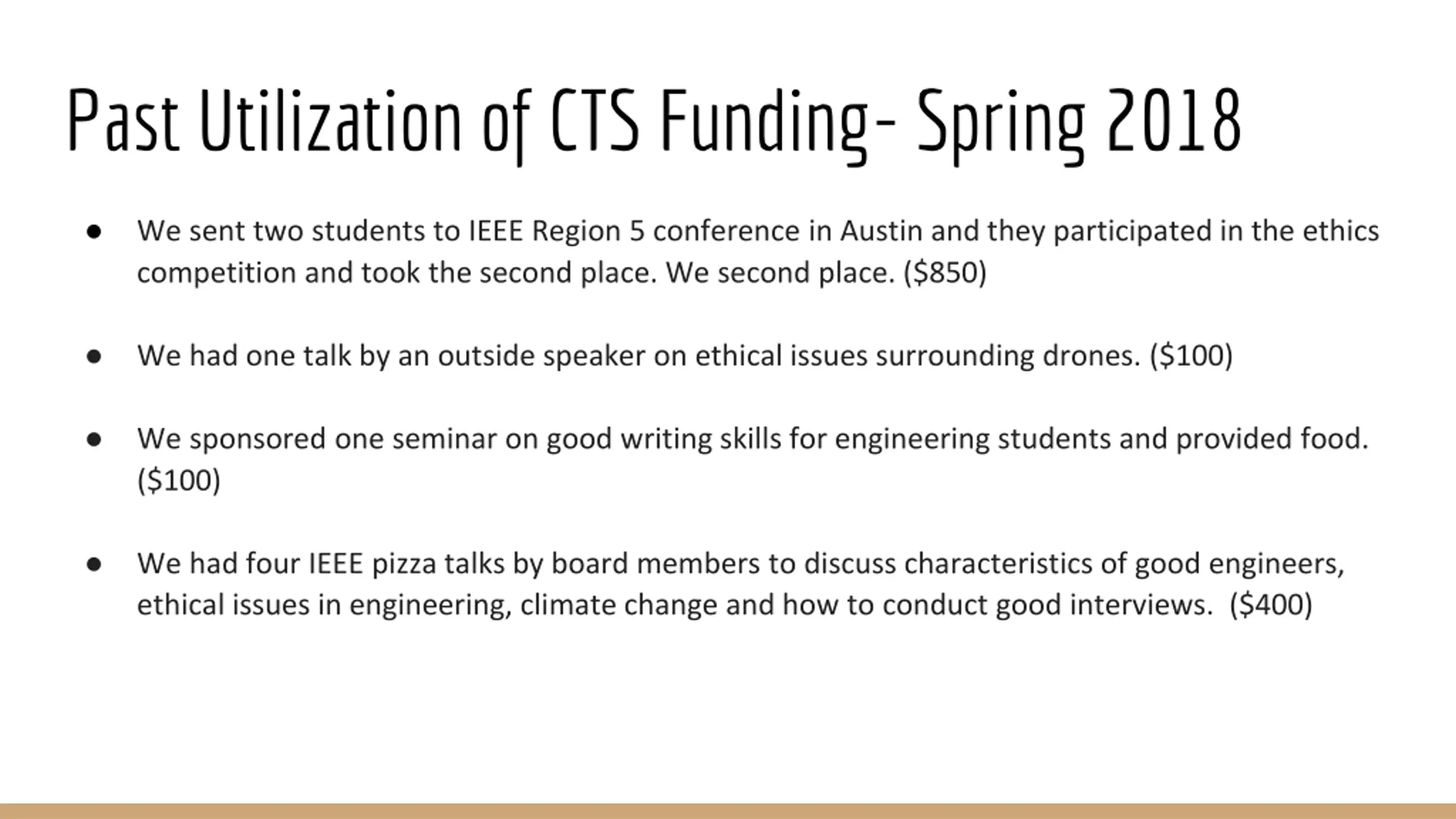 Past Utilization of CTS Funding-Spring 2018 We sent two students to IEEE Region 5 conference in Austin and they participated in the ethics competition and took the second place. We second place. ($850) We had one talk by an outside speaker on ethical issues surrounding drones. ($100) We sponsored one seminar on good writing skills for engineering students and provided food. ($100) We had four IEEE pizza talks by board members to discuss characteristics of good engineers, ethical issues in engineering, climate change and how to conduct good interviews. ($400)