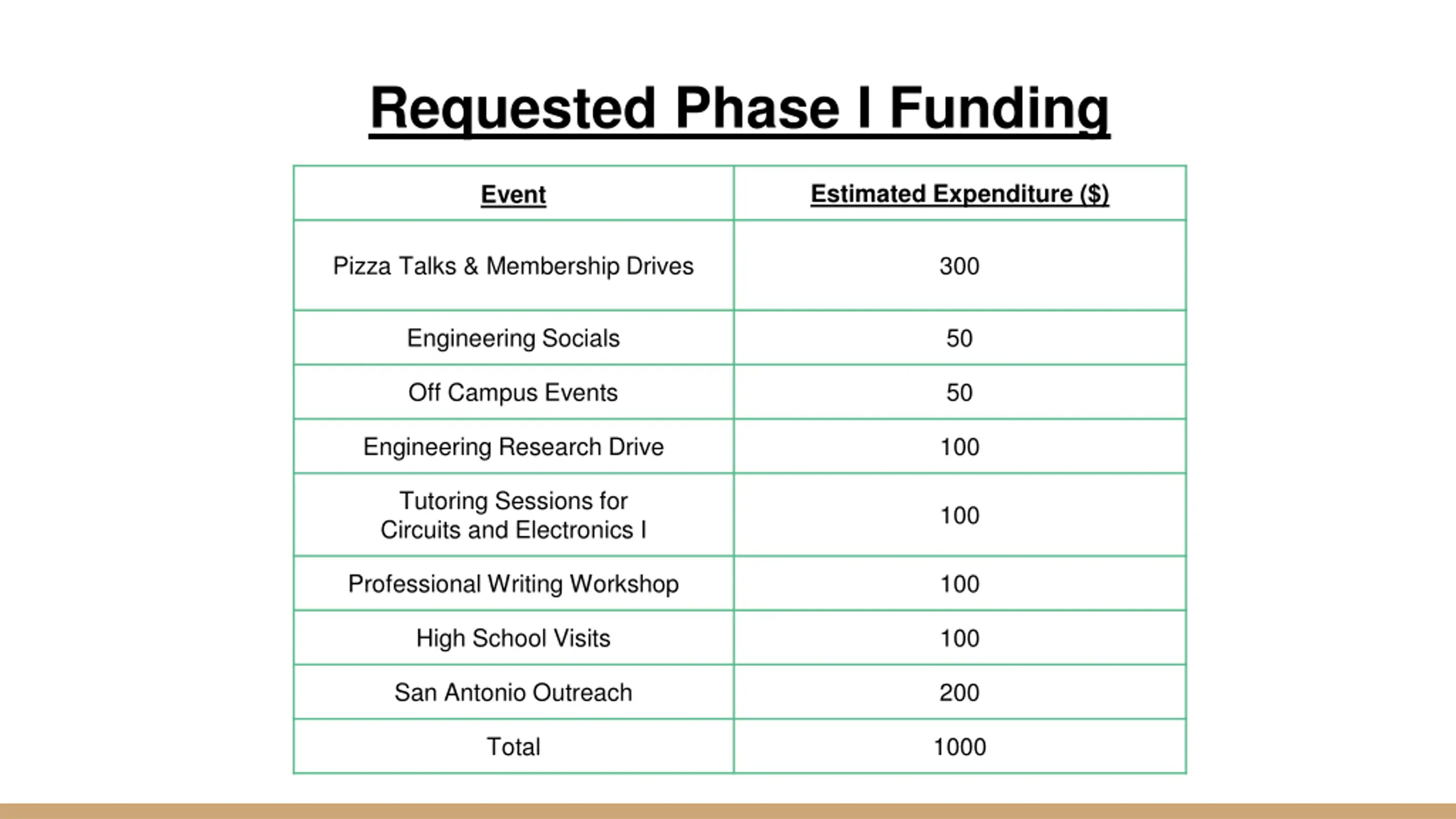 Requested Phase I Funding Estimated Expenditure ($) Event Pizza Talks & Membership Drives 300 Engineering Socials 50 Off Campus Events 50 Engineering Research Drive 100 Tutoring Sessions for Circuits and Electronics I 100 Professional Writing Workshop 100 High School Visits 100 San Antonio Outreach 200 Total 1000