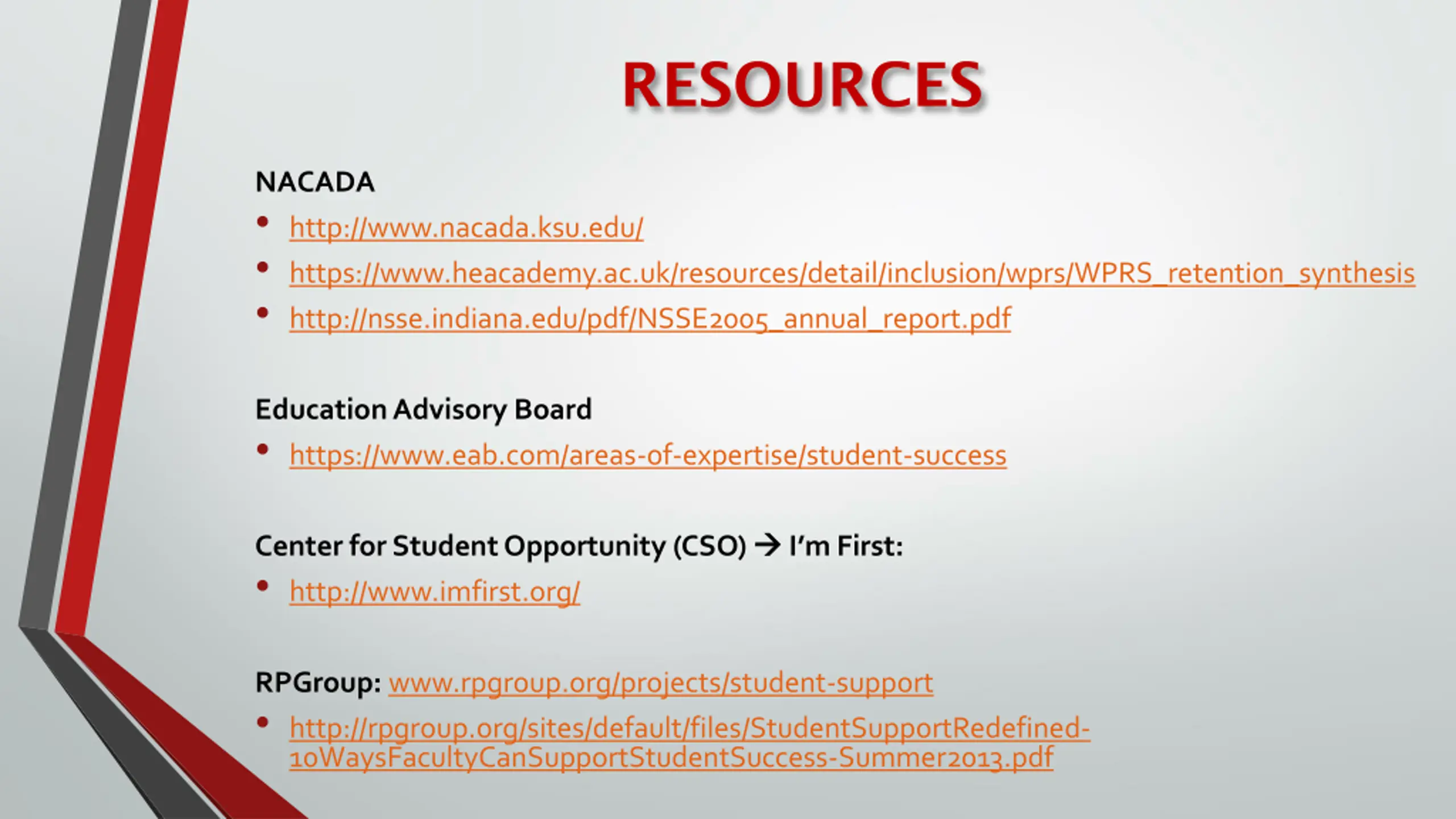 RESOURCES NACADA http://www.nacada.ksu.edu/ https://www.heacademy.ac.uk/resources/detail/inclusion/wprs/WPRS_retention_synthesis http://nsse.indiana.edu/pdf/NSSE2005_annual_report.pdf Education Advisory Board https://www.eab.com/areas-of-expertise/student-success Center for Student Opportunity (CSO) http://www.imfirst.org/ I m First: RPGroup: www.rpgroup.org/projects/student-support http://rpgroup.org/sites/default/files/StudentSupportRedefined- 10WaysFacultyCanSupportStudentSuccess-Summer2013.pdf