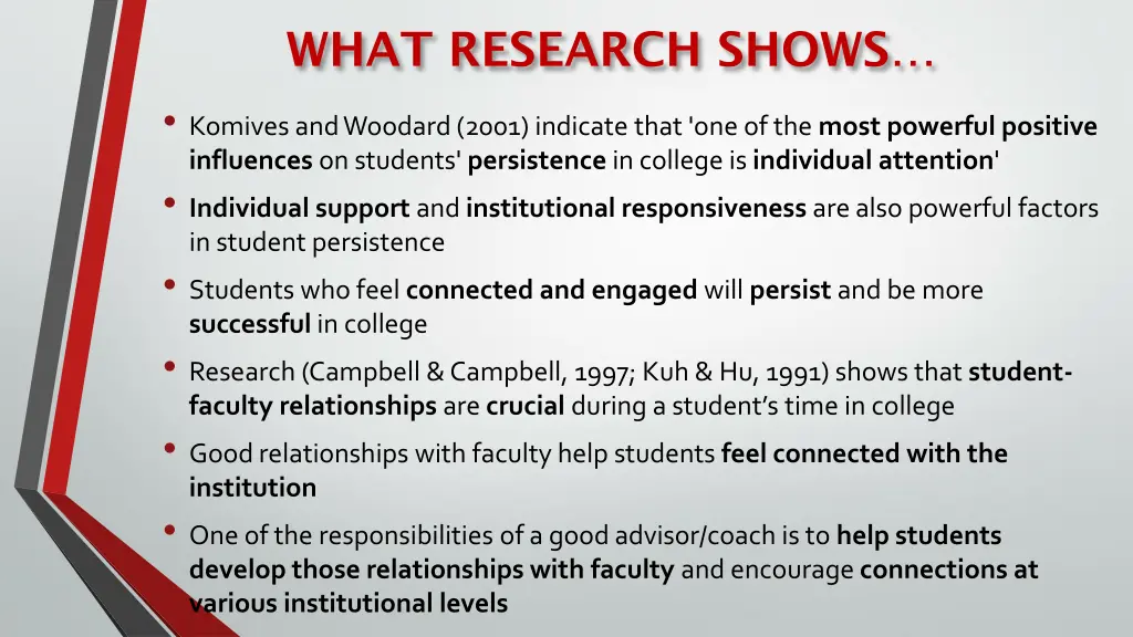 WHAT RESEARCH SHOWS Komives and Woodard (2001) indicate that 'one of the most powerful positive influences on students' persistence in college is individual attention' Individual support and institutional responsiveness are also powerful factors in student persistence Students who feel connected and engaged will persist and be more successfulin college Research (Campbell & Campbell, 1997; Kuh& Hu, 1991) shows that student- faculty relationships are crucial during a student s time in college Good relationships with faculty help students feel connected with the institution One of the responsibilities of a good advisor/coach is to help students develop those relationships with faculty and encourage connections at various institutional levels