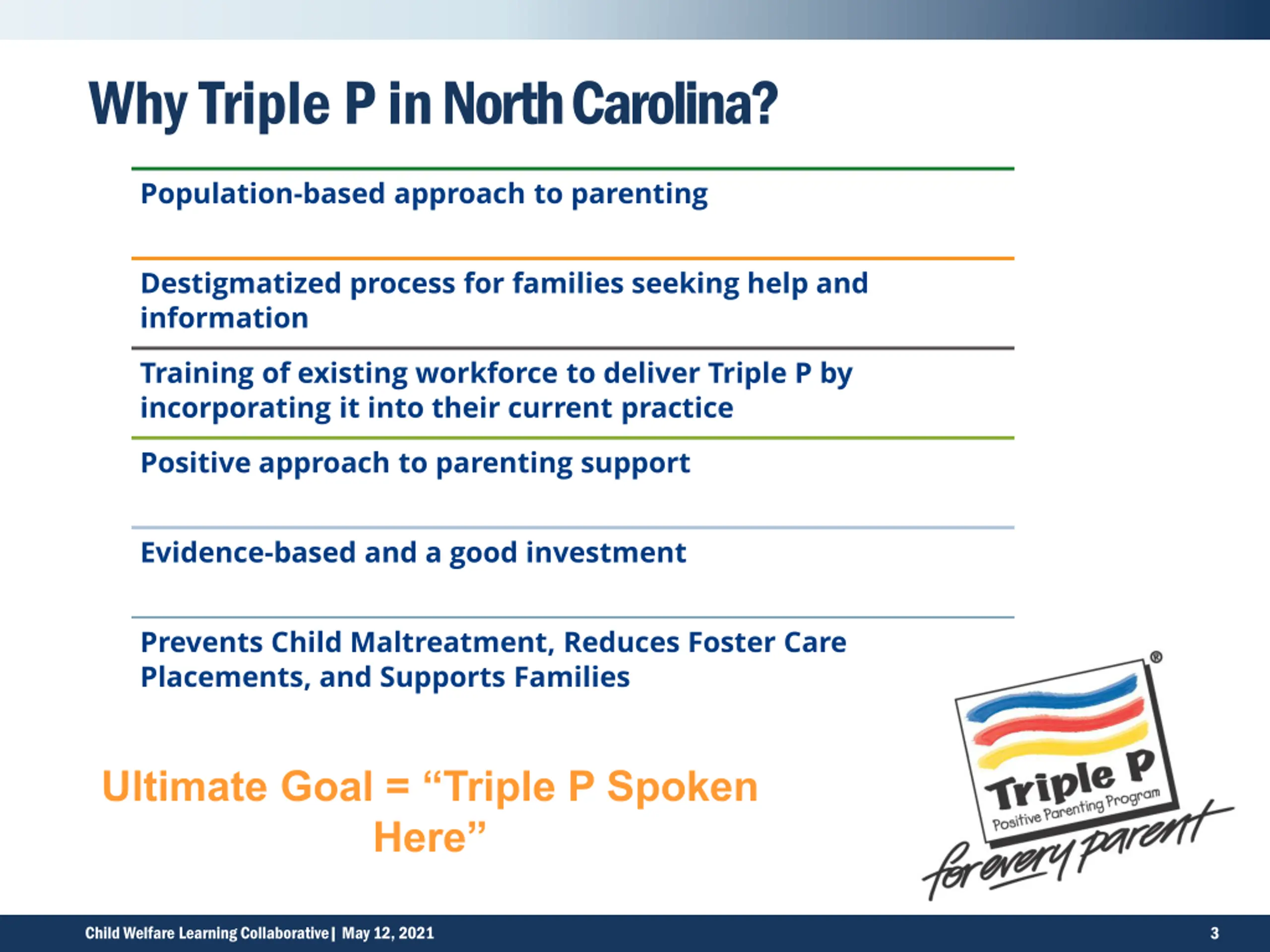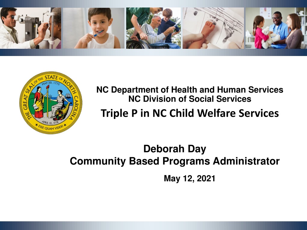NC Department of Health and Human Services NC Division of Social Services Triple P in NC Child Welfare Services Deborah Day Community Based Programs Administrator May 12, 2021