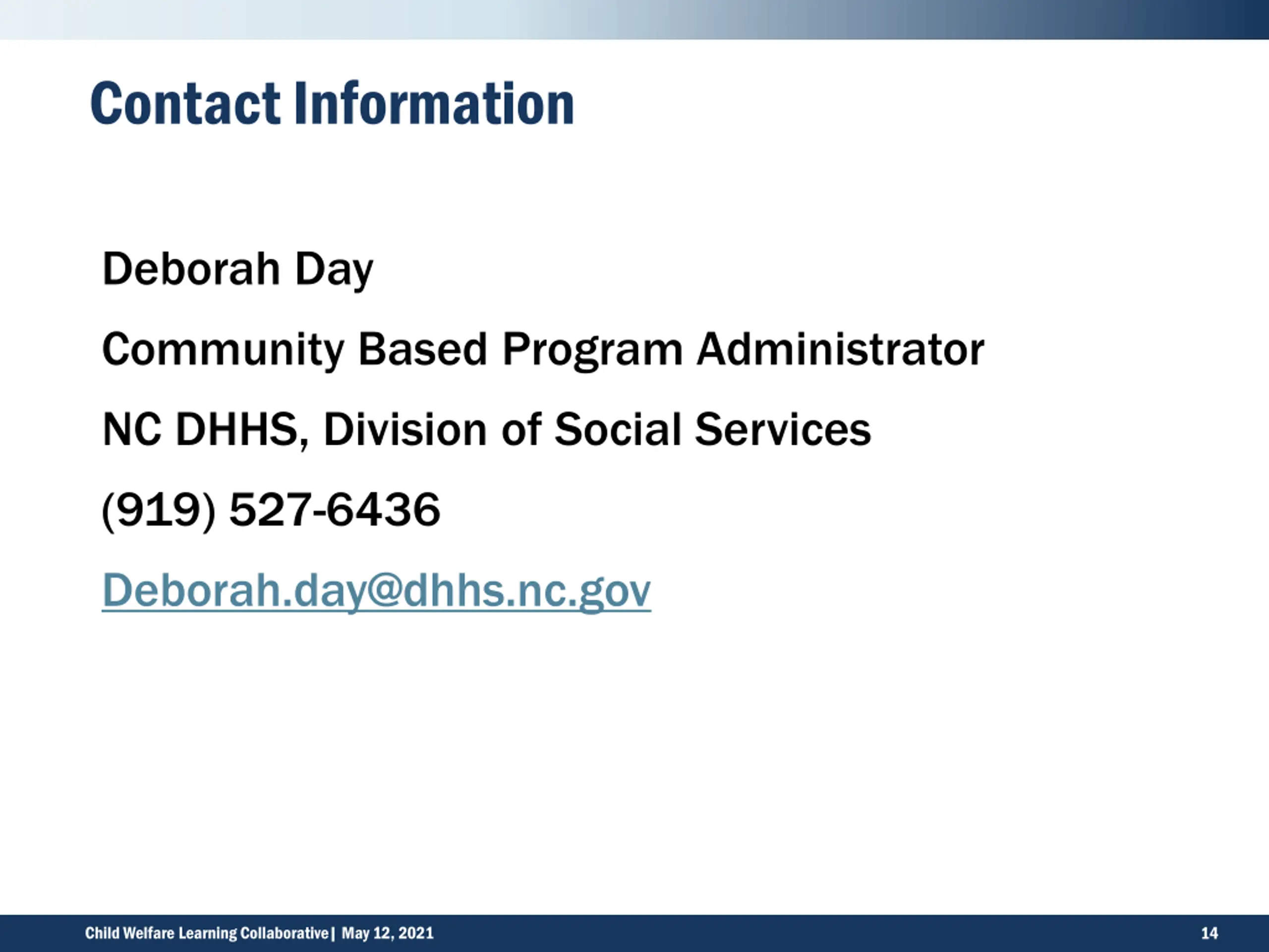 Contact Information Deborah Day Community Based Program Administrator NC DHHS, Division of Social Services (919) 527-6436 Deborah.day@dhhs.nc.gov Child Welfare Learning Collaborative| May 12, 2021 14