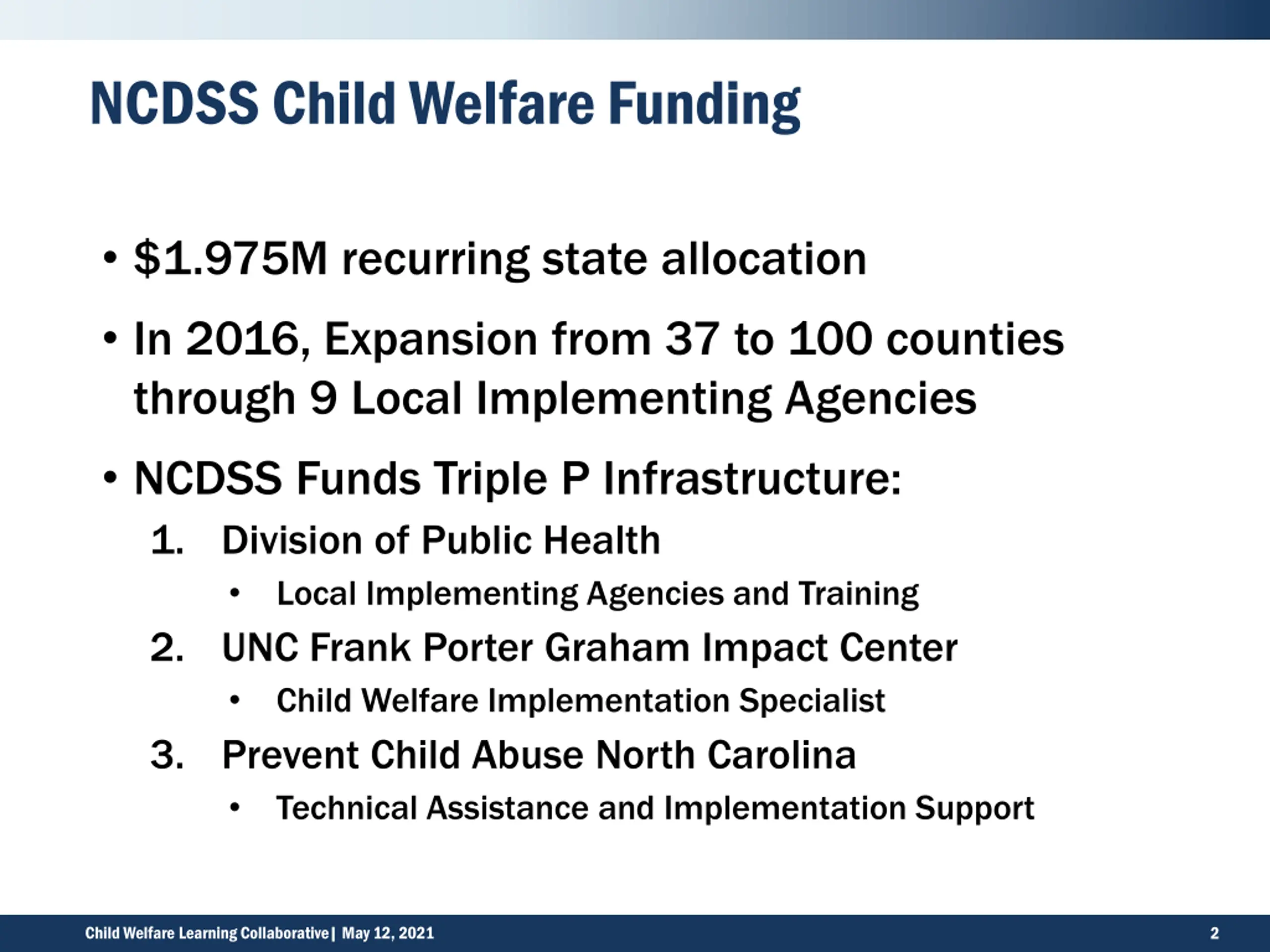 NCDSS Child Welfare Funding $1.975M recurring state allocation In 2016, Expansion from 37 to 100 counties through 9 Local Implementing Agencies NCDSS Funds Triple P Infrastructure: 1. Division of Public Health Local Implementing Agencies and Training 2. UNC Frank Porter Graham Impact Center Child Welfare Implementation Specialist 3. Prevent Child Abuse North Carolina Technical Assistance and Implementation Support Child Welfare Learning Collaborative| May 12, 2021 2