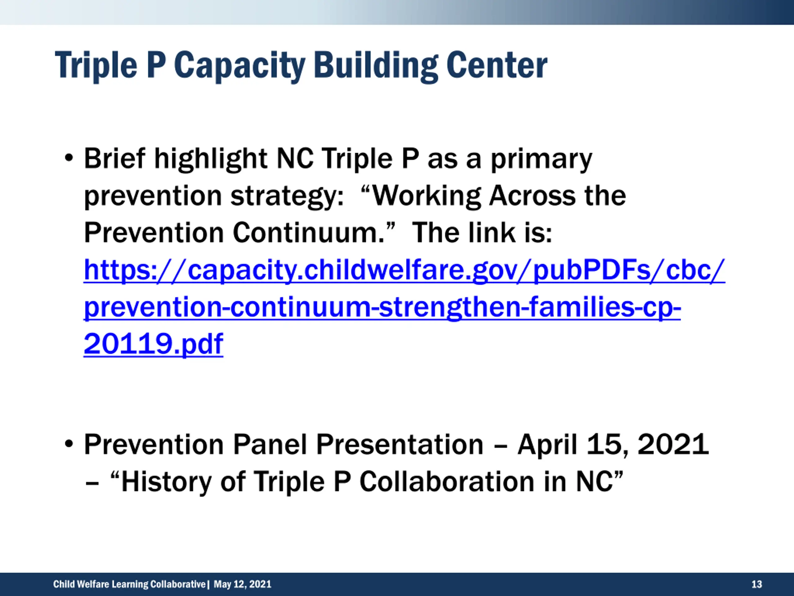 Triple P Capacity Building Center Brief highlight NC Triple P as a primary prevention strategy: Working Across the Prevention Continuum. The link is: https://capacity.childwelfare.gov/pubPDFs/cbc/ prevention-continuum-strengthen-families-cp- 20119.pdf Prevention Panel Presentation April 15, 2021 History of Triple P Collaboration in NC Child Welfare Learning Collaborative| May 12, 2021 13
