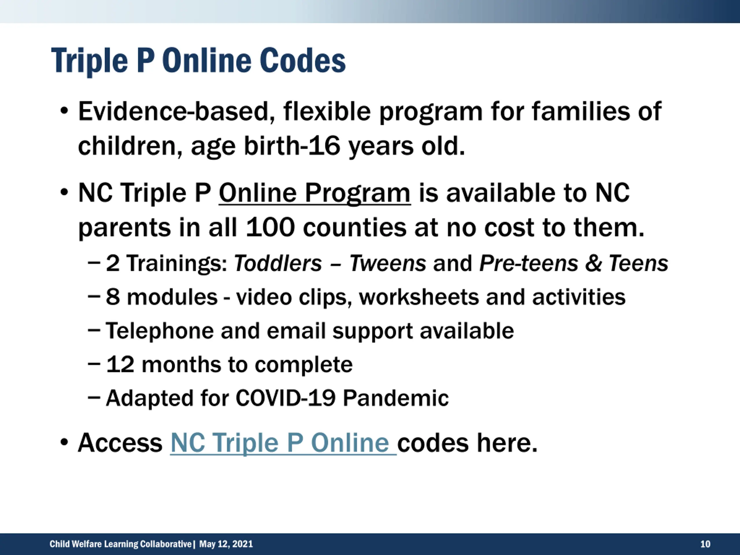 Triple P Online Codes Evidence-based, flexible program for families of children, age birth-16 years old. NC Triple P Online Program is available to NC parents in all 100 counties at no cost to them. 2 Trainings: Toddlers Tweens and Pre-teens & Teens 8 modules - video clips, worksheets and activities Telephone and email support available 12 months to complete Adapted for COVID-19 Pandemic Access NC Triple P Online codes here. Child Welfare Learning Collaborative| May 12, 2021 10