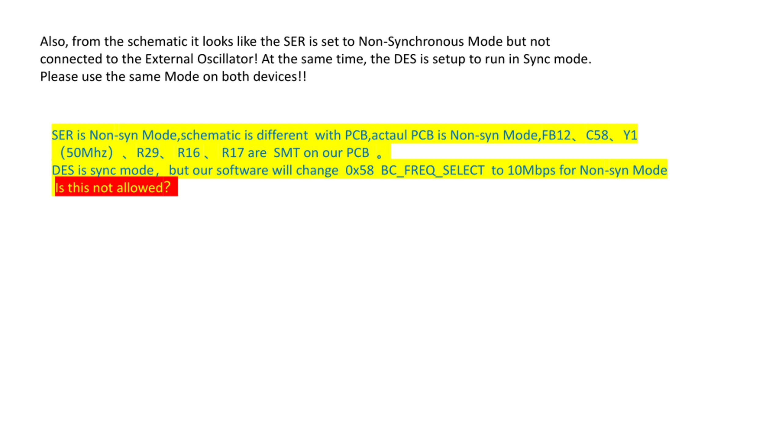 Also, from the schematic it looks like the SER is set to Non-Synchronous Mode but not connected to the External Oscillator! At the same time, the DES is setup to run in Sync mode. Please use the same Mode on both devices!! SER is Non-syn Mode,schematic is different with PCB,actaul PCB is Non-syn Mode,FB12 C58 Y1 50Mhz R29 R16 R17 are SMT on our PCB DES is sync mode but our software will change 0x58 BC_FREQ_SELECT to 10Mbps for Non-syn Mode Is this not allowed