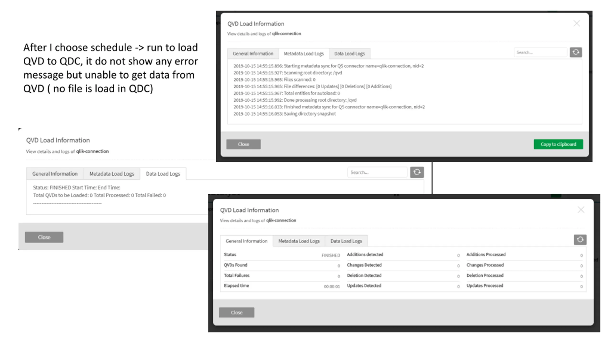 After I choose schedule -> run to load QVD to QDC, it do not show any error message but unable to get data from QVD ( no file is load in QDC)