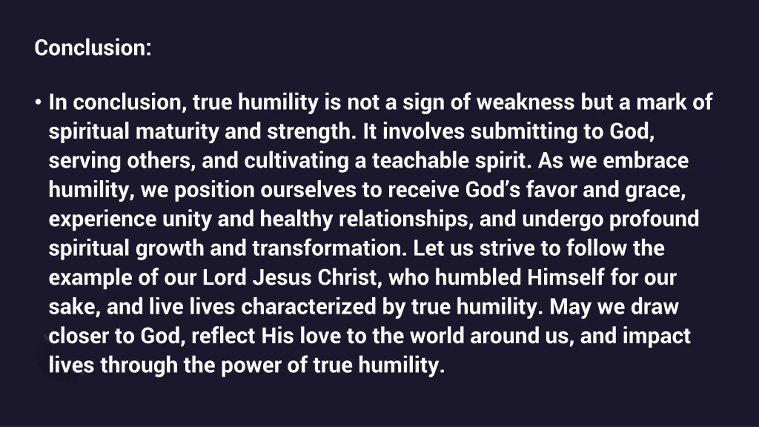 Conclusion: In conclusion, true humility is not a sign of weakness but a mark of spiritual maturity and strength. It involves submitting to God, serving others, and cultivating a teachable spirit. As we embrace humility, we position ourselves to receive God s favor and grace, experience unity and healthy relationships, and undergo profound spiritual growth and transformation. Let us strive to follow the example of our Lord Jesus Christ, who humbled Himself for our sake, and live lives characterized by true humility. May we draw closer to God, reflect His love to the world around us, and impact lives through the power of true humility.