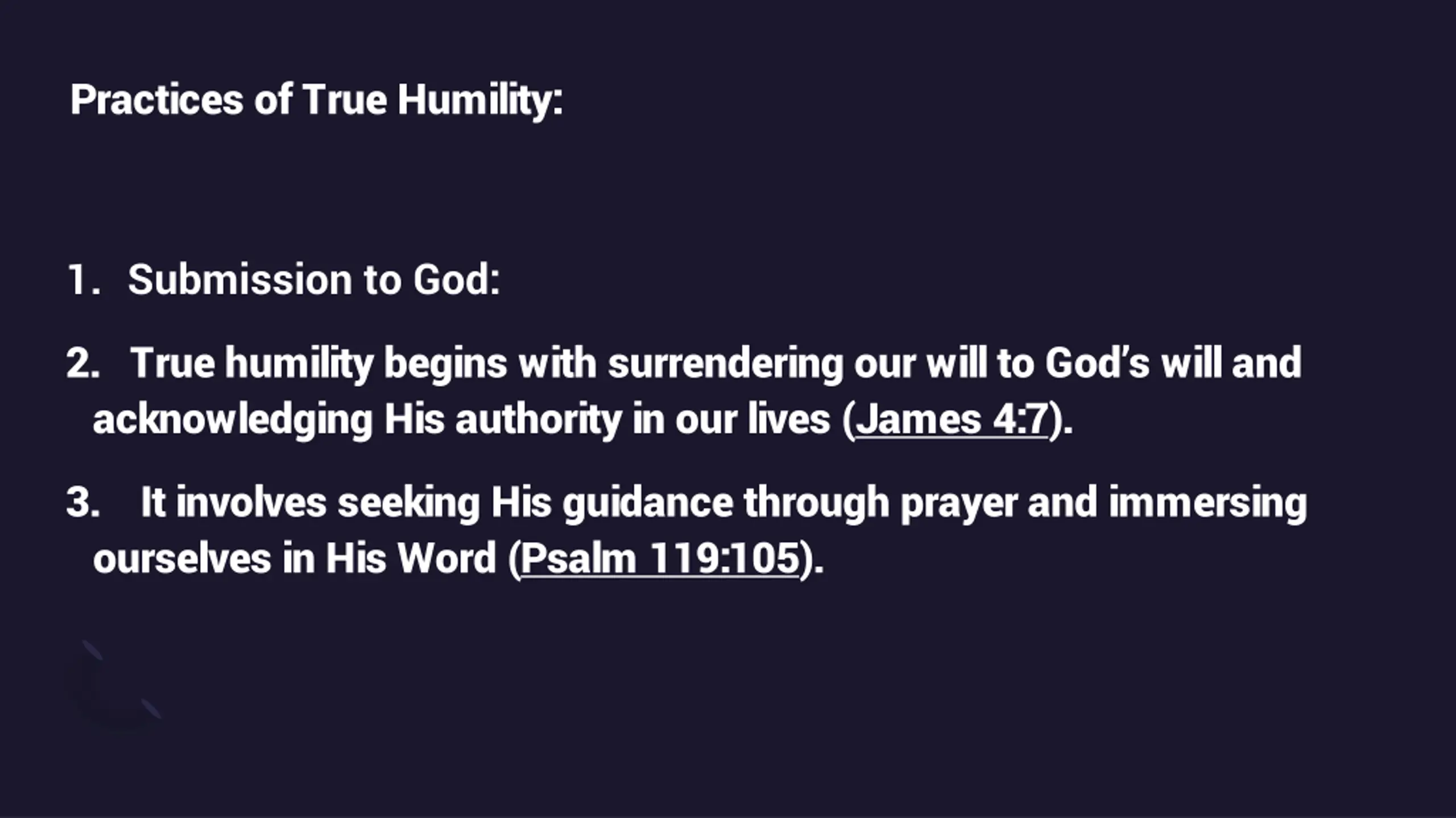 Practices of True Humility: 1. Submission to God: 2. True humility begins with surrendering our will to God s will and acknowledging His authority in our lives (James 4:7). 3. It involves seeking His guidance through prayer and immersing ourselves in His Word (Psalm 119:105).