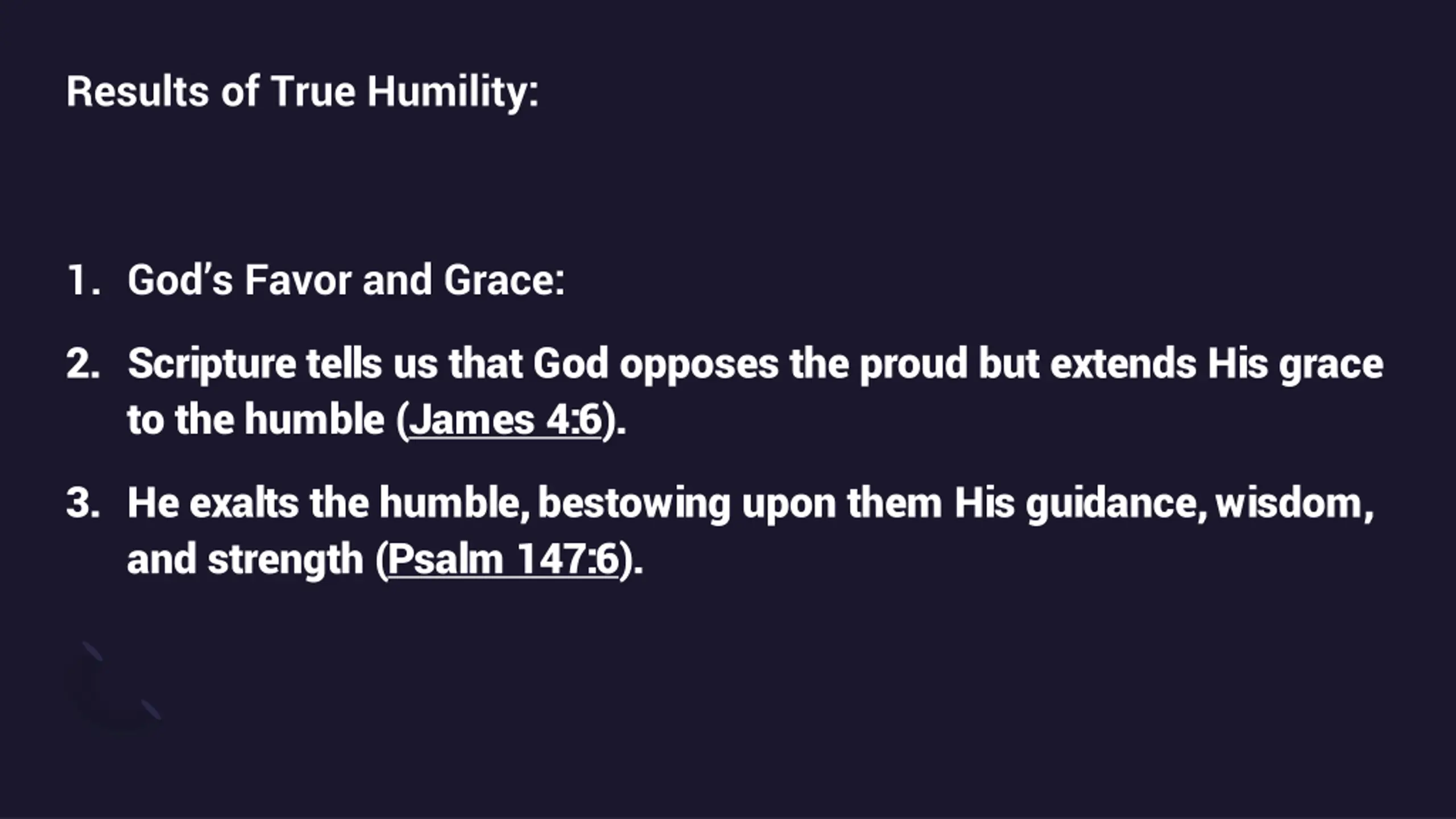 Results of True Humility: 1. God s Favor and Grace: 2. Scripture tells us that God opposes the proud but extends His grace to the humble (James 4:6). 3. He exalts the humble, bestowing upon them His guidance, wisdom, and strength (Psalm 147:6).