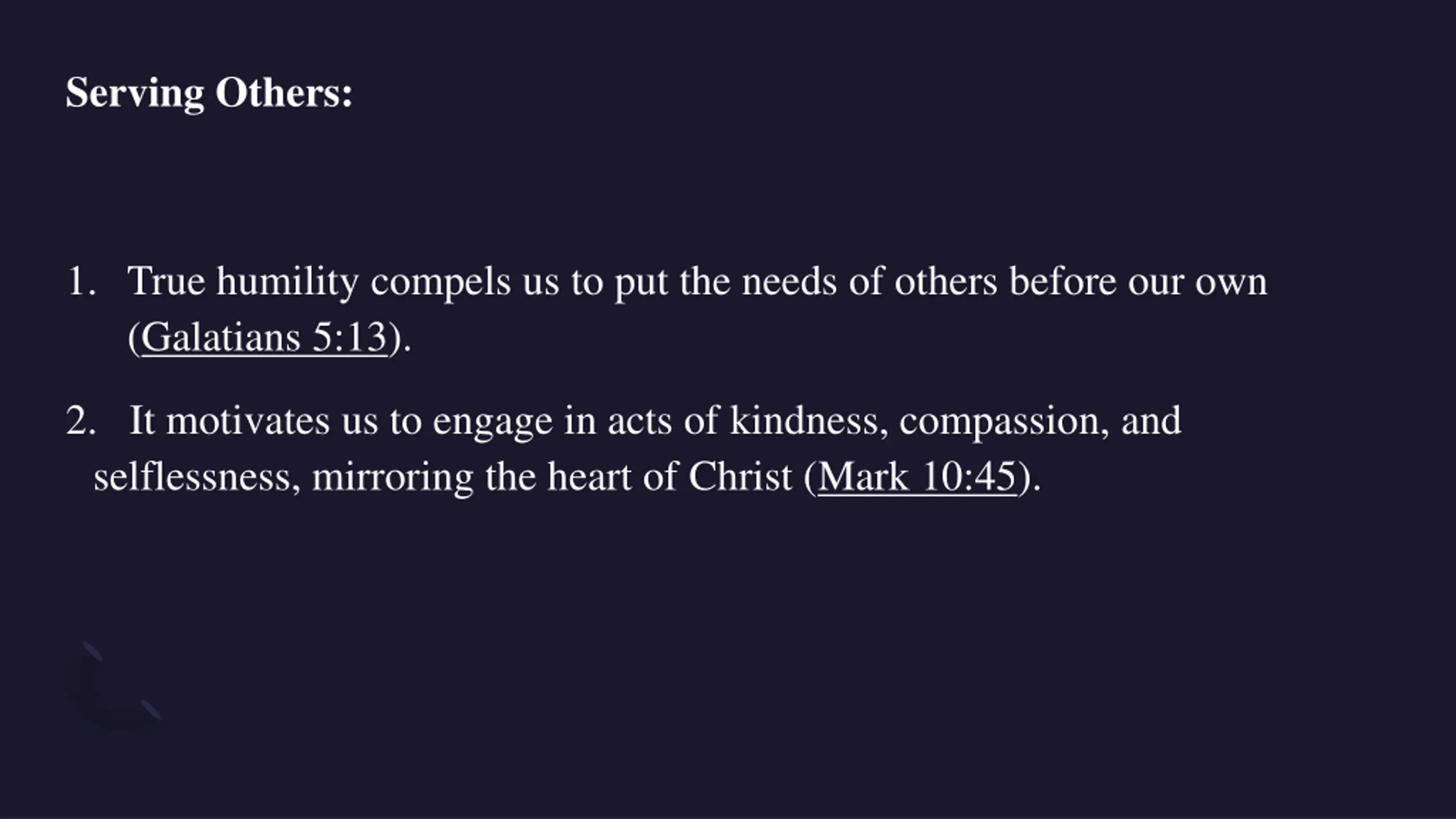 Serving Others: 1. True humility compels us to put the needs of others before our own (Galatians 5:13). 2. It motivates us to engage in acts of kindness, compassion, and selflessness, mirroring the heart of Christ (Mark 10:45).