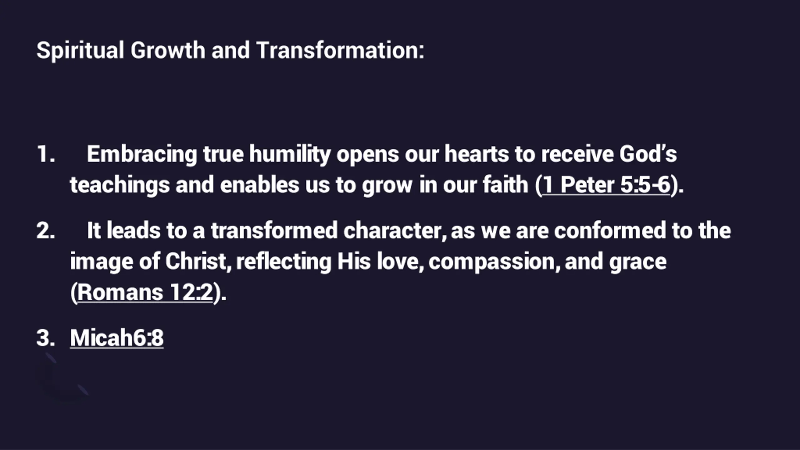 Spiritual Growth and Transformation: 1. Embracing true humility opens our hearts to receive God s teachings and enables us to grow in our faith (1 Peter 5:5-6). 2. It leads to a transformed character, as we are conformed to the image of Christ, reflecting His love, compassion, and grace (Romans 12:2). 3. Micah6:8