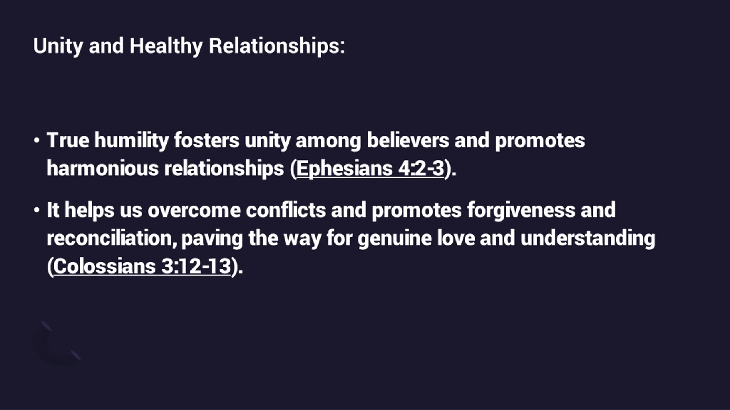 Unity and Healthy Relationships: True humility fosters unity among believers and promotes harmonious relationships (Ephesians 4:2-3). It helps us overcome conflicts and promotes forgiveness and reconciliation, paving the way for genuine love and understanding (Colossians 3:12-13).