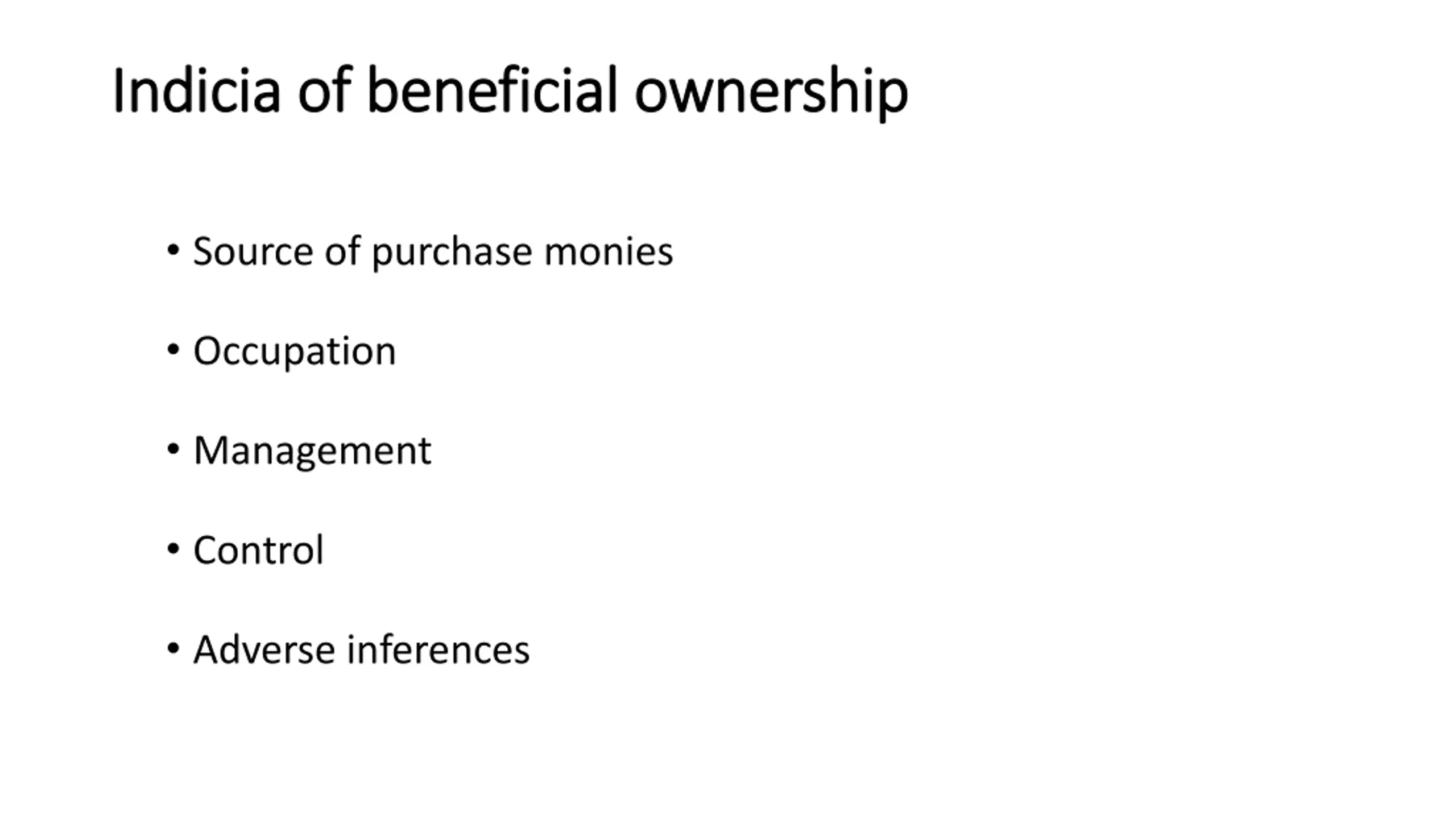 Indicia of beneficial ownership Indicia of beneficial ownership Source of purchase monies Occupation Management Control Adverse inferences