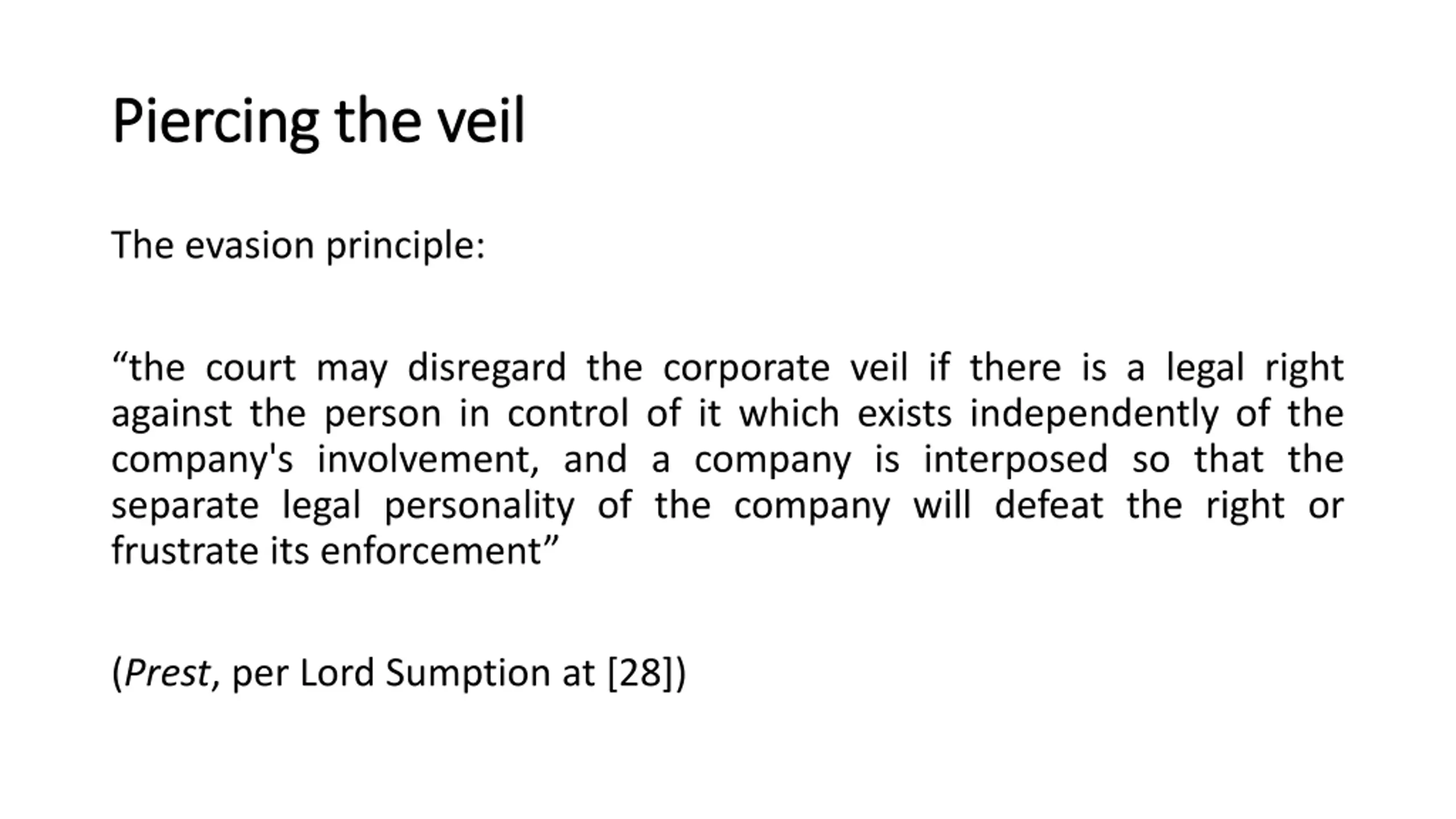 Piercing the veil Piercing the veil The evasion principle: the court may disregard the corporate veil if there is a legal right against the person in control of it which exists independently of the company's involvement, and a company is interposed so that the separate legal personality of the company will defeat the right or frustrate its enforcement (Prest, per Lord Sumption at [28])