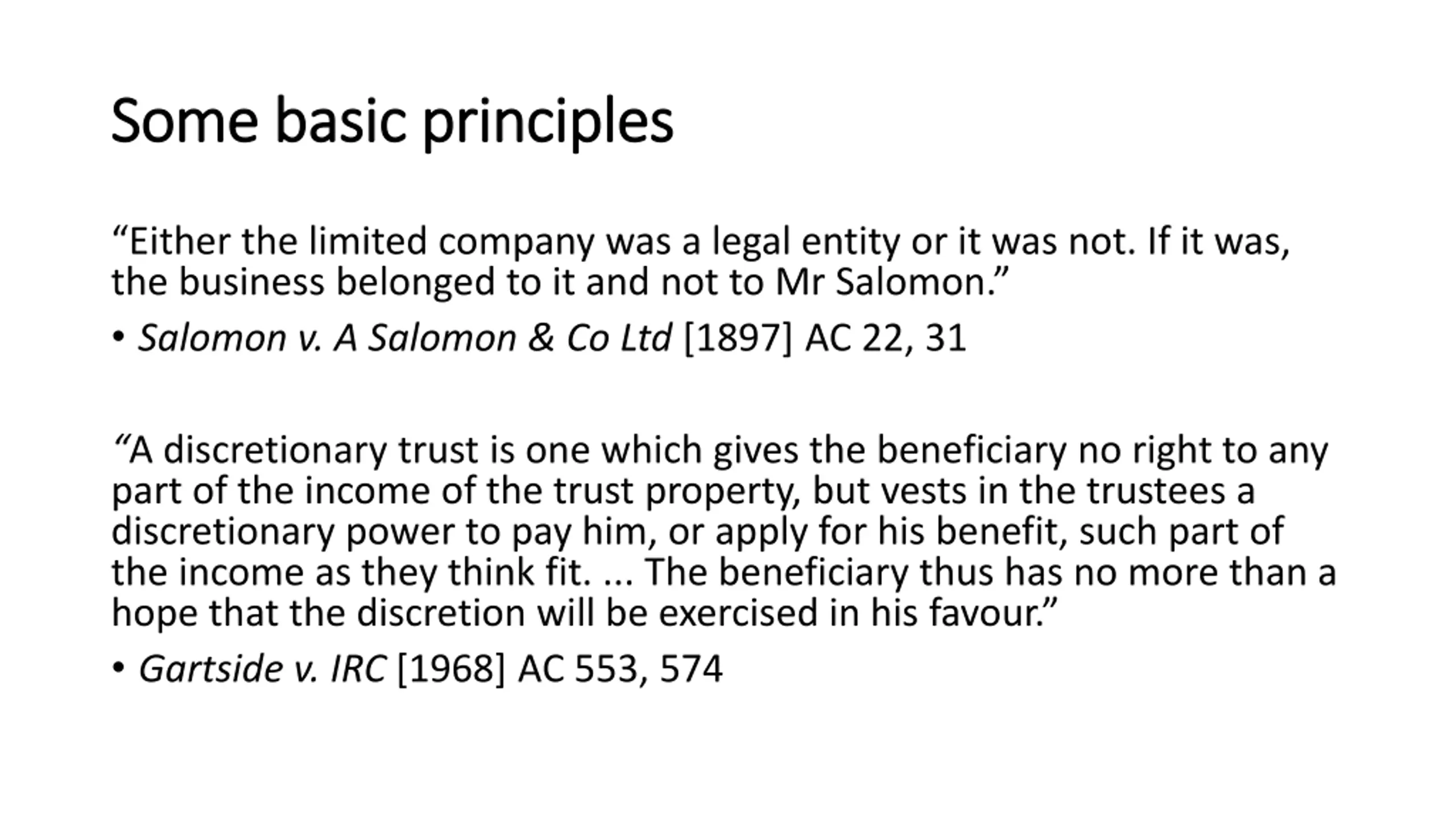 Some basic principles Some basic principles Either the limited company was a legal entity or it was not. If it was, the business belonged to it and not to Mr Salomon. Salomon v. A Salomon & Co Ltd [1897] AC 22, 31 A discretionary trust is one which gives the beneficiary no right to any part of the income of the trust property, but vests in the trustees a discretionary power to pay him, or apply for his benefit, such part of the income as they think fit. ... The beneficiary thus has no more than a hope that the discretion will be exercised in his favour. Gartside v. IRC [1968] AC 553, 574