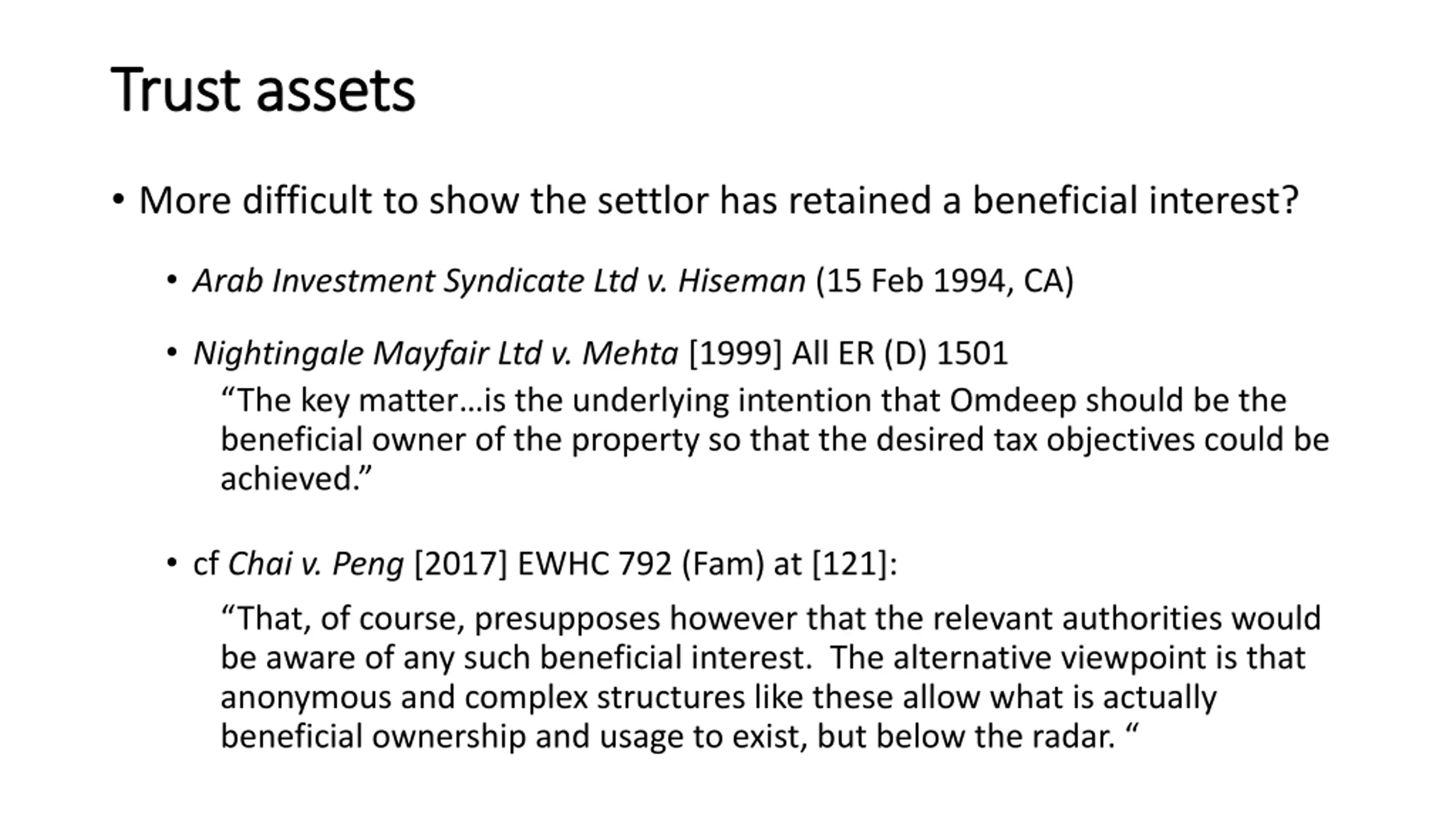 Trust assets Trust assets More difficult to show the settlor has retained a beneficial interest? Arab Investment Syndicate Ltd v. Hiseman (15 Feb 1994, CA) Nightingale Mayfair Ltd v. Mehta [1999] All ER (D) 1501 The key matter is the underlying intention that Omdeep should be the beneficial owner of the property so that the desired tax objectives could be achieved. cf Chai v. Peng [2017] EWHC 792 (Fam) at [121]: That, of course, presupposes however that the relevant authorities would be aware of any such beneficial interest. The alternative viewpoint is that anonymous and complex structures like these allow what is actually beneficial ownership and usage to exist, but below the radar.
