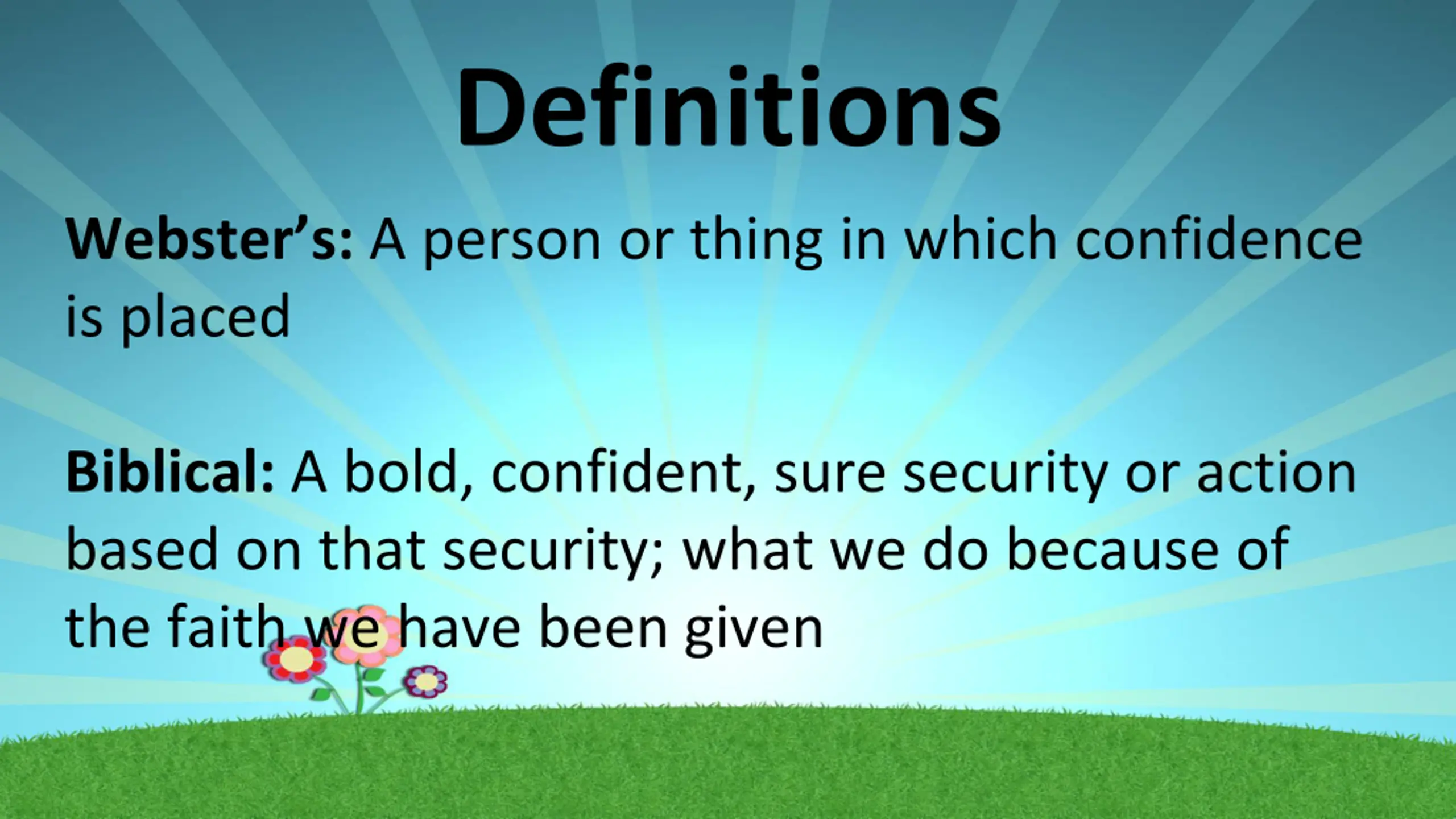 Definitions Webster s: A person or thing in which confidence is placed Biblical: A bold, confident, sure security or action based on that security; what we do because of the faith we have been given