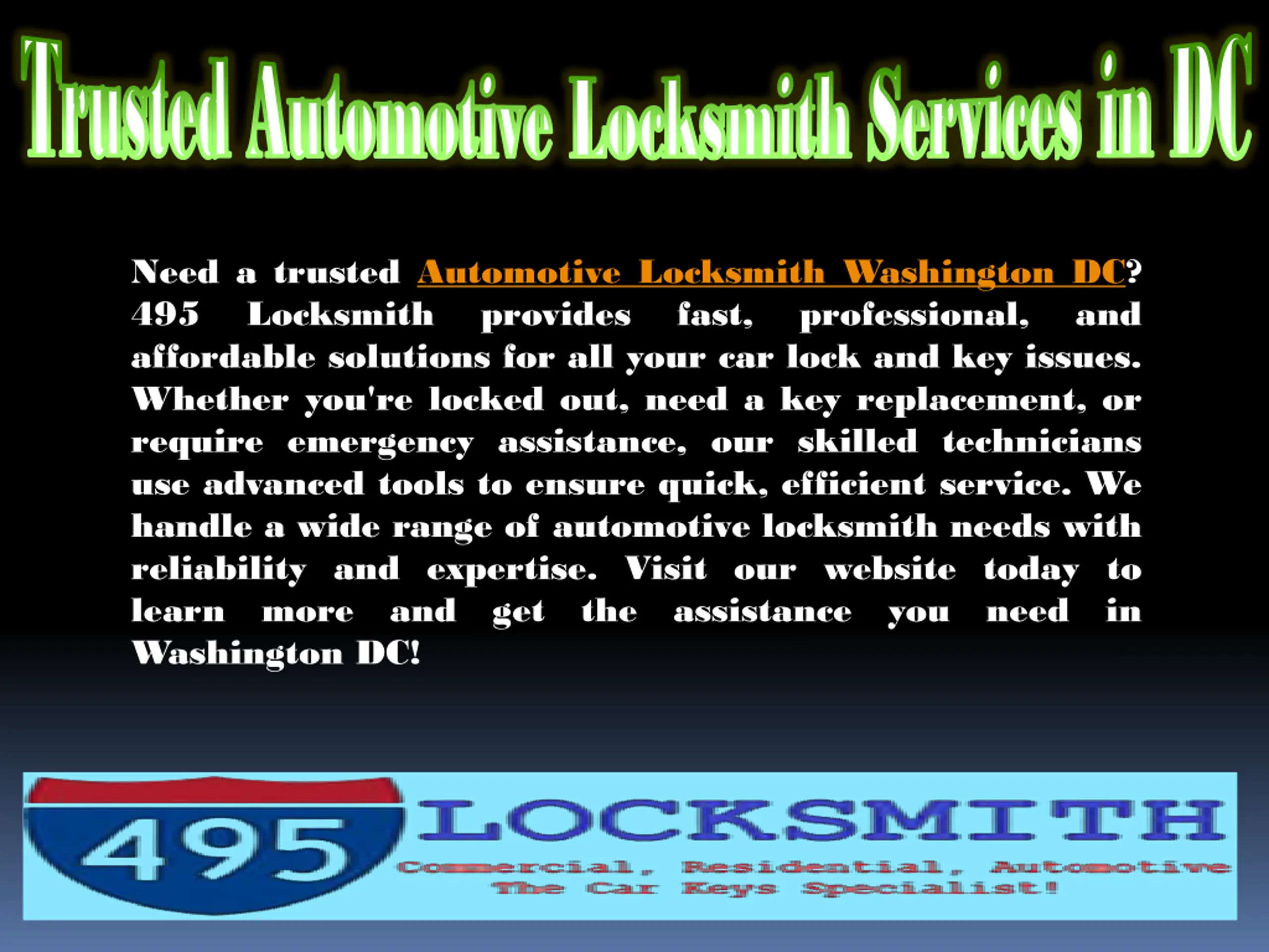 Trusted Automotive Locksmith Services in DC Trusted Automotive Locksmith Services in DC Need a trusted Automotive Locksmith Washington DC? 495 Locksmith provides affordable solutions for all your car lock and key issues. Whether you're locked out, need a key replacement, or require emergency assistance, our skilled technicians use advanced tools to ensure quick, efficient service. We handle a wide range of automotive locksmith needs with reliability and expertise. Visit our website today to learn more and get the assistance you need in Washington DC! fast, professional, and