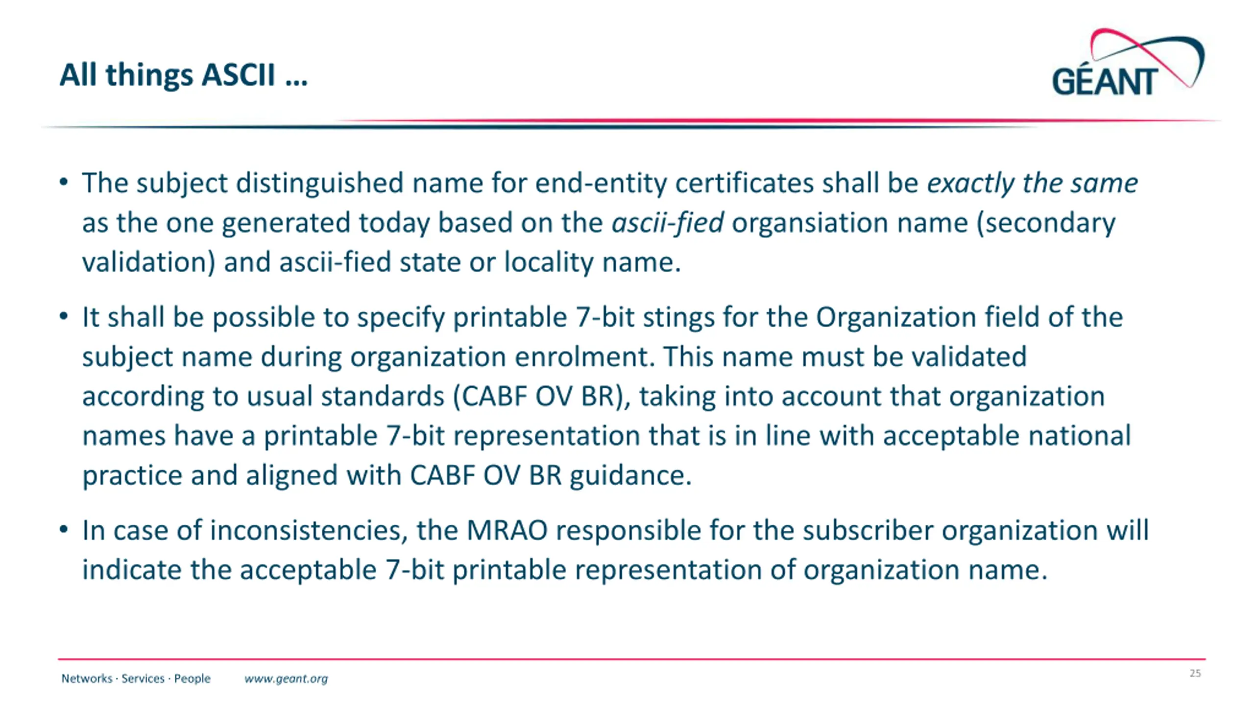 All things ASCII The subject distinguished name for end-entity certificates shall be exactly the same as the one generated today based on the ascii-fied organsiation name (secondary validation) and ascii-fied state or locality name. It shall be possible to specify printable 7-bit stings for the Organization field of the subject name during organization enrolment. This name must be validated according to usual standards (CABF OV BR), taking into account that organization names have a printable 7-bit representation that is in line with acceptable national practice and aligned with CABF OV BR guidance. In case of inconsistencies, the MRAO responsible for the subscriber organization will indicate the acceptable 7-bit printable representation of organization name. 25 Networks Services People www.geant.org