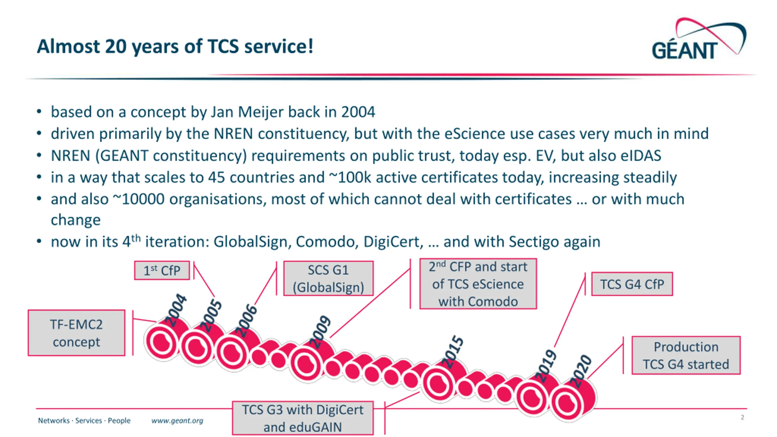 Almost 20 years of TCS service! based on a concept by Jan Meijer back in 2004 driven primarily by the NREN constituency, but with the eScience use cases very much in mind NREN (GEANT constituency) requirements on public trust, today esp. EV, but also eIDAS in a way that scales to 45 countries and ~100k active certificates today, increasing steadily and also ~10000 organisations, most of which cannot deal with certificates or with much change now in its 4thiteration: GlobalSign, Comodo, DigiCert, and with Sectigo again 2nd CFP and start of TCS eScience with Comodo SCS G1 (GlobalSign) 1st CfP TCS G4 CfP TF-EMC2 concept Production TCS G4 started TCS G3 with DigiCert and eduGAIN 2 Networks Services People www.geant.org