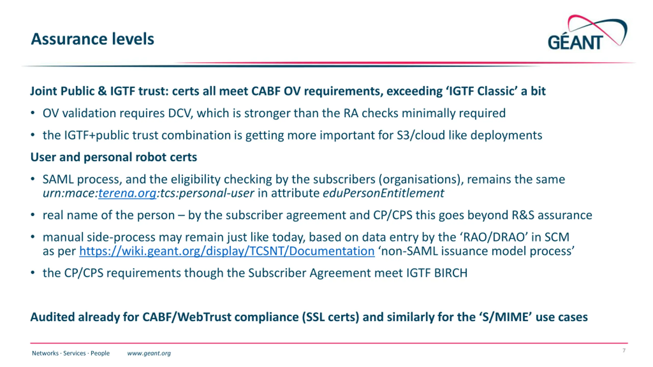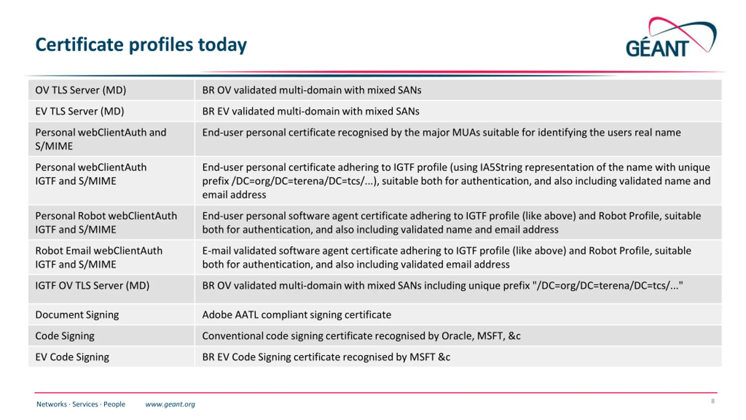 Assurance levels Joint Public & IGTF trust: certs all meet CABF OV requirements, exceeding IGTF Classic a bit OV validation requires DCV, which is stronger than the RA checks minimally required the IGTF+public trust combination is getting more important for S3/cloud like deployments User and personal robot certs SAML process, and the eligibility checking by the subscribers (organisations), remains the same urn:mace:terena.org:tcs:personal-user in attribute eduPersonEntitlement real name of the person by the subscriber agreement and CP/CPS this goes beyond R&S assurance manual side-process may remain just like today, based on data entry by the RAO/DRAO in SCM as per https://wiki.geant.org/display/TCSNT/Documentation non-SAML issuance model process the CP/CPS requirements though the Subscriber Agreement meet IGTF BIRCH Audited already for CABF/WebTrust compliance (SSL certs) and similarly for the S/MIME use cases 7 Networks Services People www.geant.org