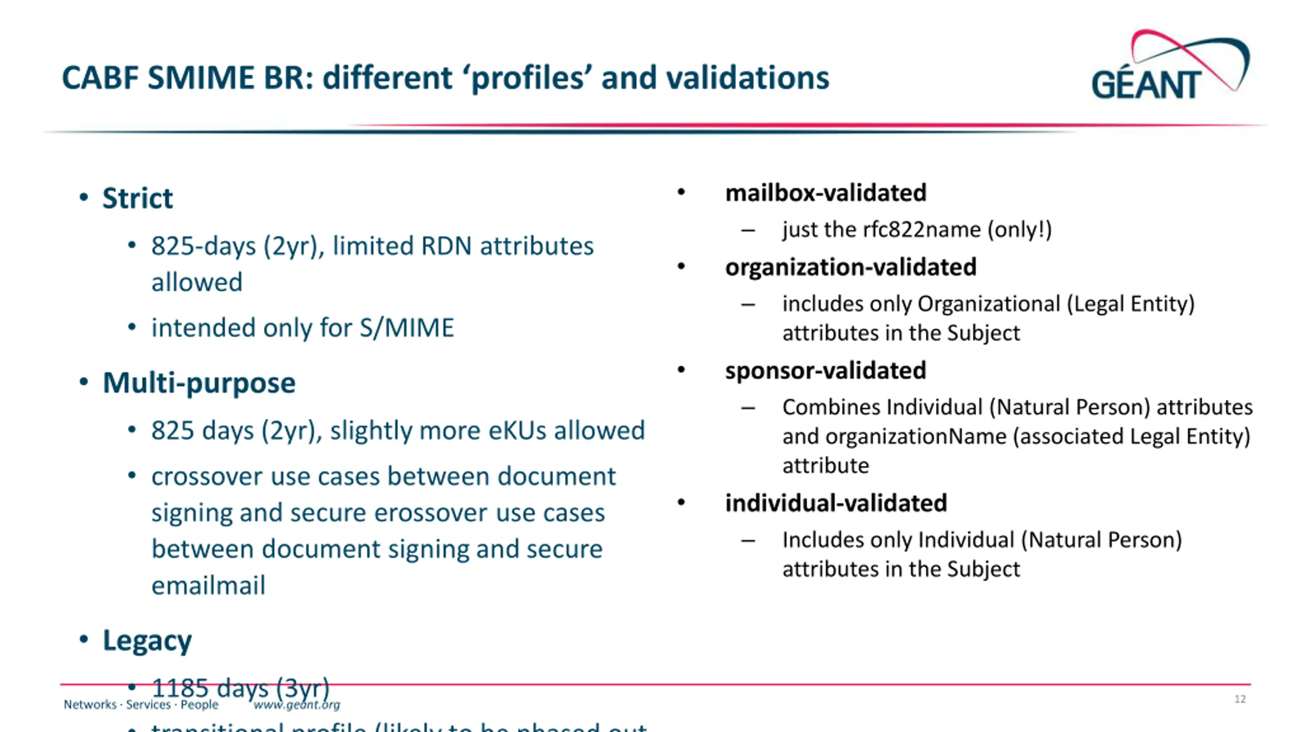 Public Trust S/MIME (personal) is getting regulated It was basically a free-for-all , as long as the email address worked most useful use for the general public signing was in bespoke certificates types (Adobe) or in Qualified Certificates (EC regulated) until now, the IGTF personal requirements were much stricter than public email signing, in that we did insist on a reasonable name and a sponsor (organization) that was validated shortest summary: IGTF (BIRCH) assurance level remains >= SMIME BR https://cabforum.org/wp-content/uploads/CA-Browser-Forum-SMIMEBR-1.0.0.pdf 11 Networks Services People www.geant.org