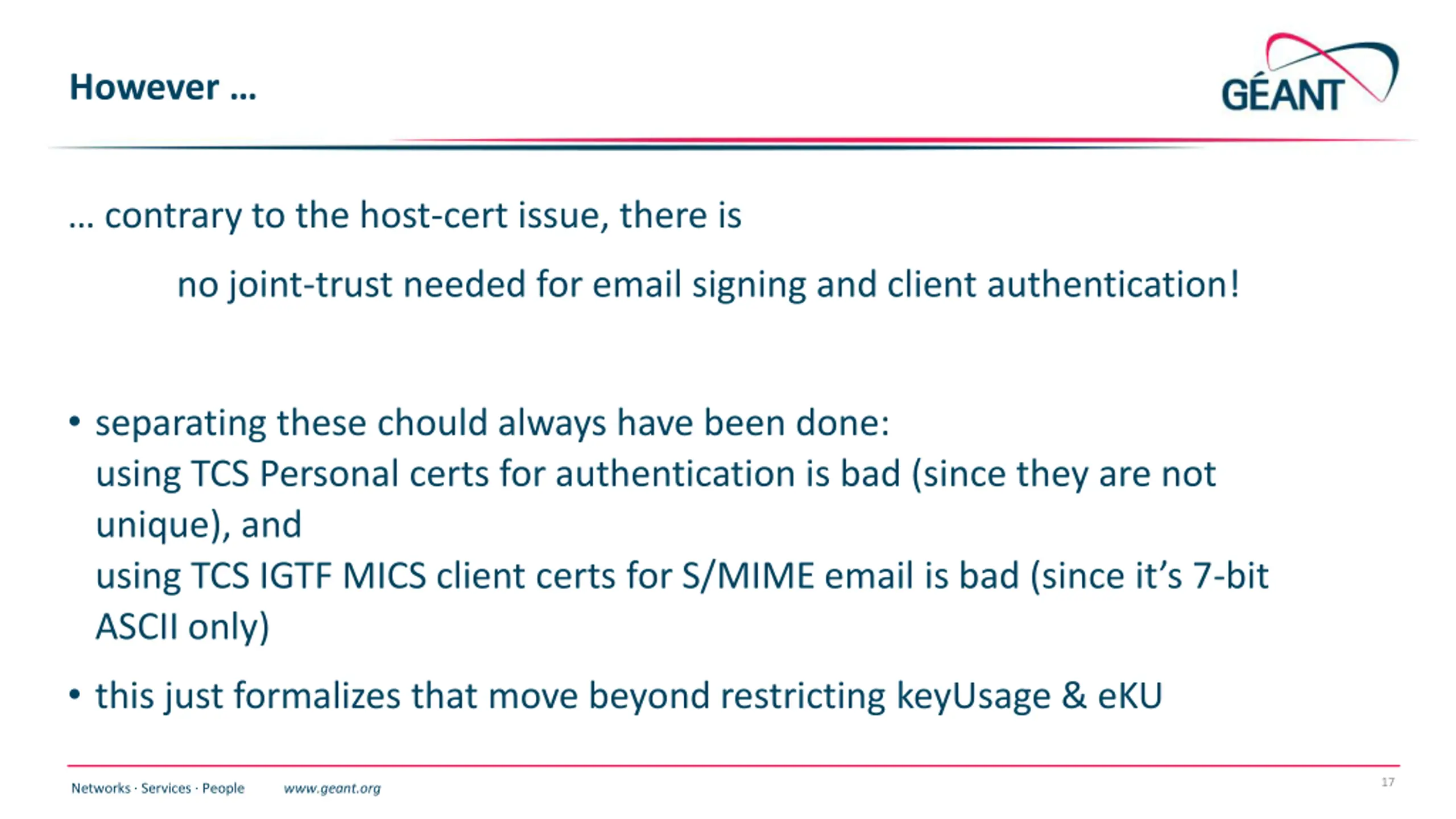 However contrary to the host-cert issue, there is no joint-trust needed for email signing and client authentication! separating these chould always have been done: using TCS Personal certs for authentication is bad (since they are not unique), and using TCS IGTF MICS client certs for S/MIME email is bad (since it s 7-bit ASCII only) this just formalizes that move beyond restricting keyUsage & eKU 17 Networks Services People www.geant.org