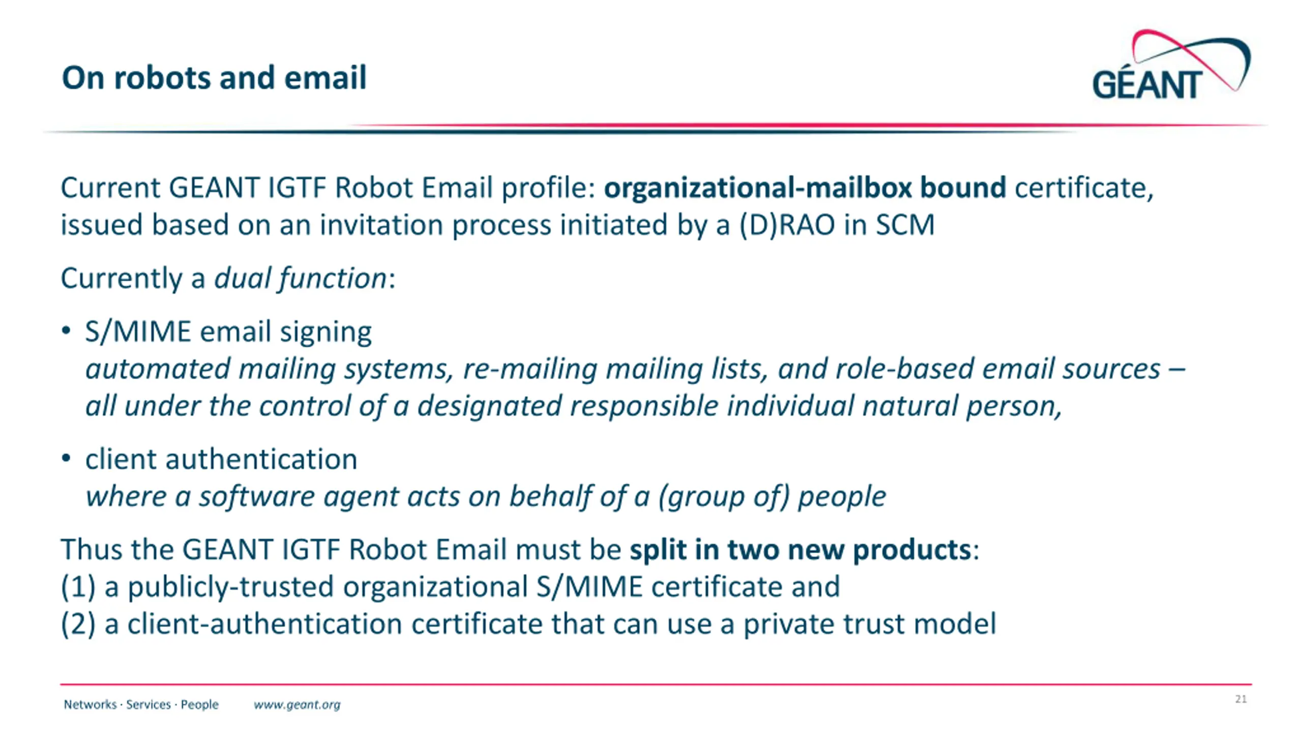 On robots and email Current GEANT IGTF Robot Email profile: organizational-mailbox bound certificate, issued based on an invitation process initiated by a (D)RAO in SCM Currently a dual function: S/MIME email signing automated mailing systems, re-mailing mailing lists, and role-based email sources all under the control of a designated responsible individual natural person, client authentication where a software agent acts on behalf of a (group of) people Thus the GEANT IGTF Robot Email must be split in two new products: (1) a publicly-trusted organizational S/MIME certificate and (2) a client-authentication certificate that can use a private trust model 21 Networks Services People www.geant.org