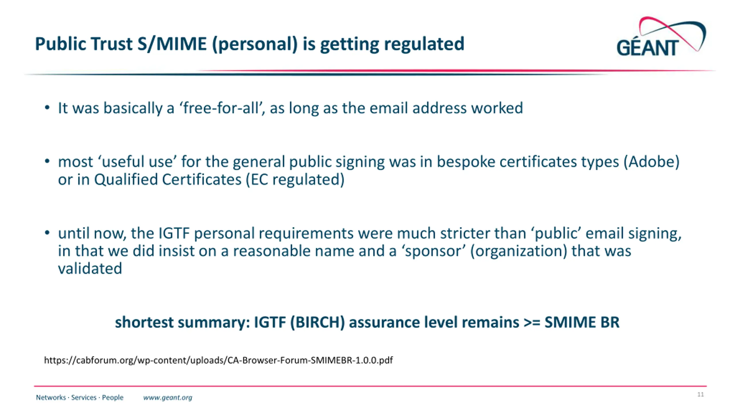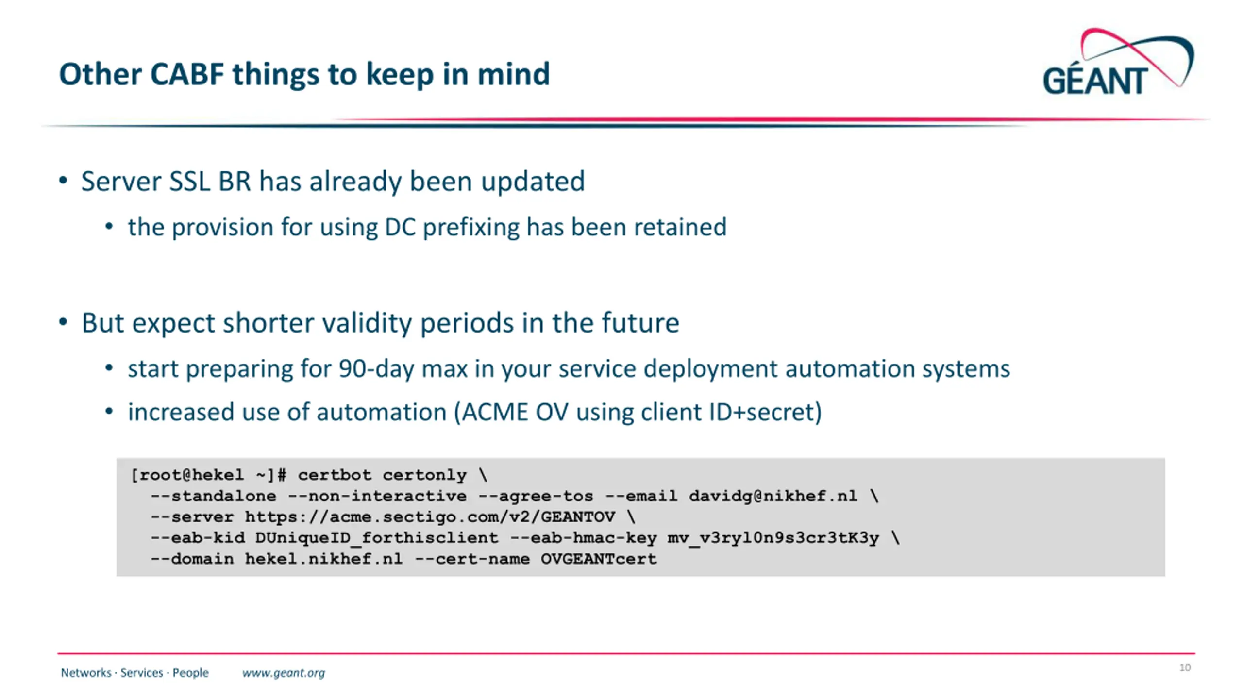 Other CABF things to keep in mind Server SSL BR has already been updated the provision for using DC prefixing has been retained But expect shorter validity periods in the future start preparing for 90-day max in your service deployment automation systems increased use of automation (ACME OV using client ID+secret) [root@hekel ~]# certbot certonly \ --standalone --non-interactive --agree-tos --email davidg@nikhef.nl \ --server https://acme.sectigo.com/v2/GEANTOV \ --eab-kid DUniqueID_forthisclient --eab-hmac-key mv_v3ryl0n9s3cr3tK3y \ --domain hekel.nikhef.nl --cert-name OVGEANTcert 10 Networks Services People www.geant.org