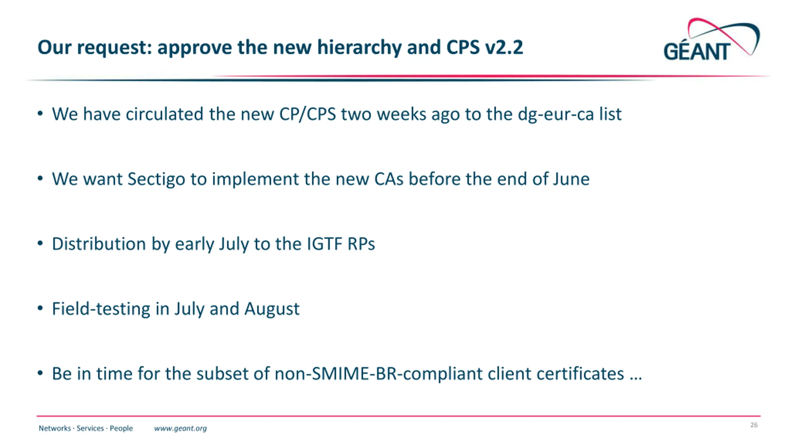 Our request: approve the new hierarchy and CPS v2.2 We have circulated the new CP/CPS two weeks ago to the dg-eur-ca list We want Sectigo to implement the new CAs before the end of June Distribution by early July to the IGTF RPs Field-testing in July and August Be in time for the subset of non-SMIME-BR-compliant client certificates 26 Networks Services People www.geant.org