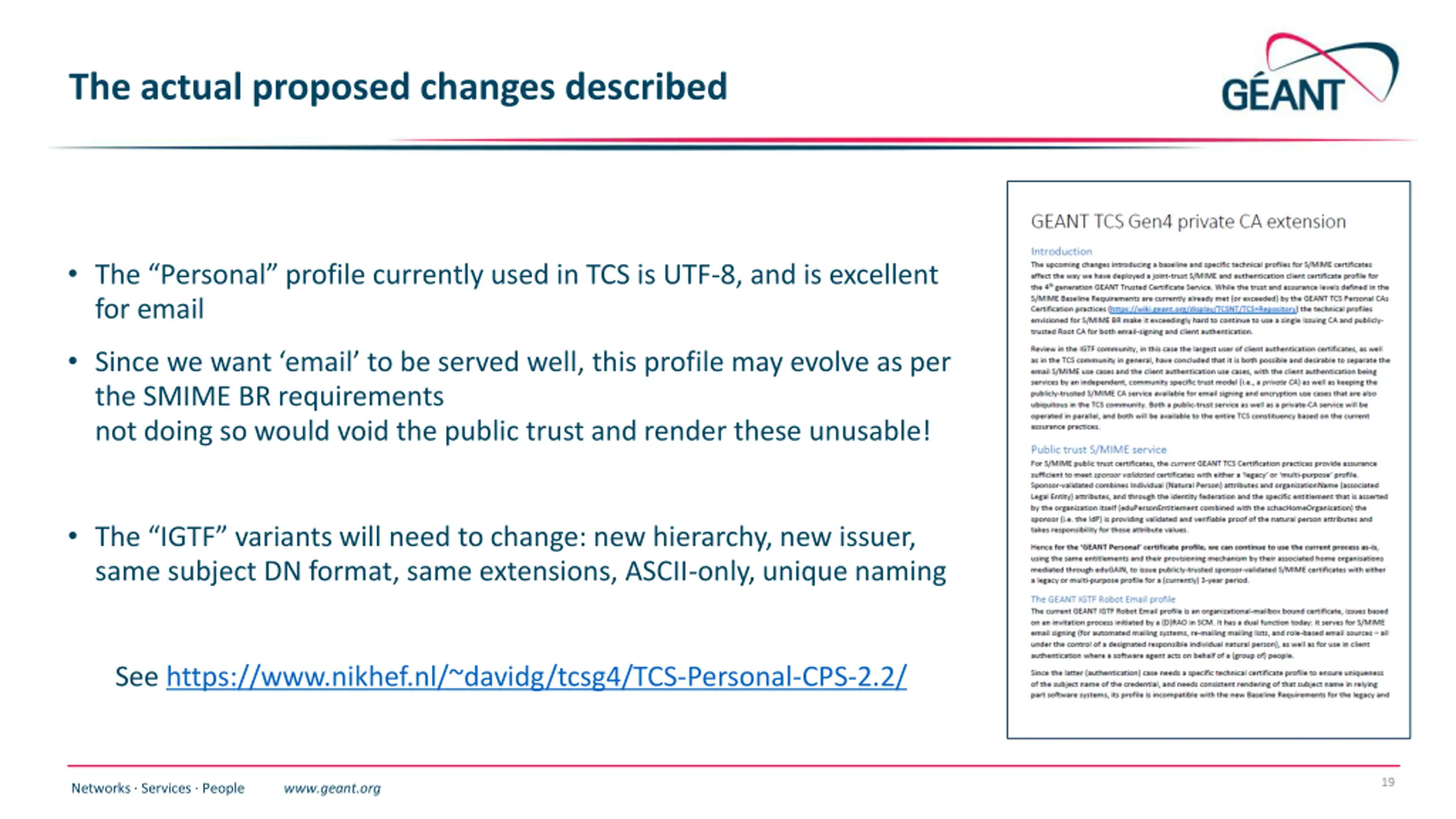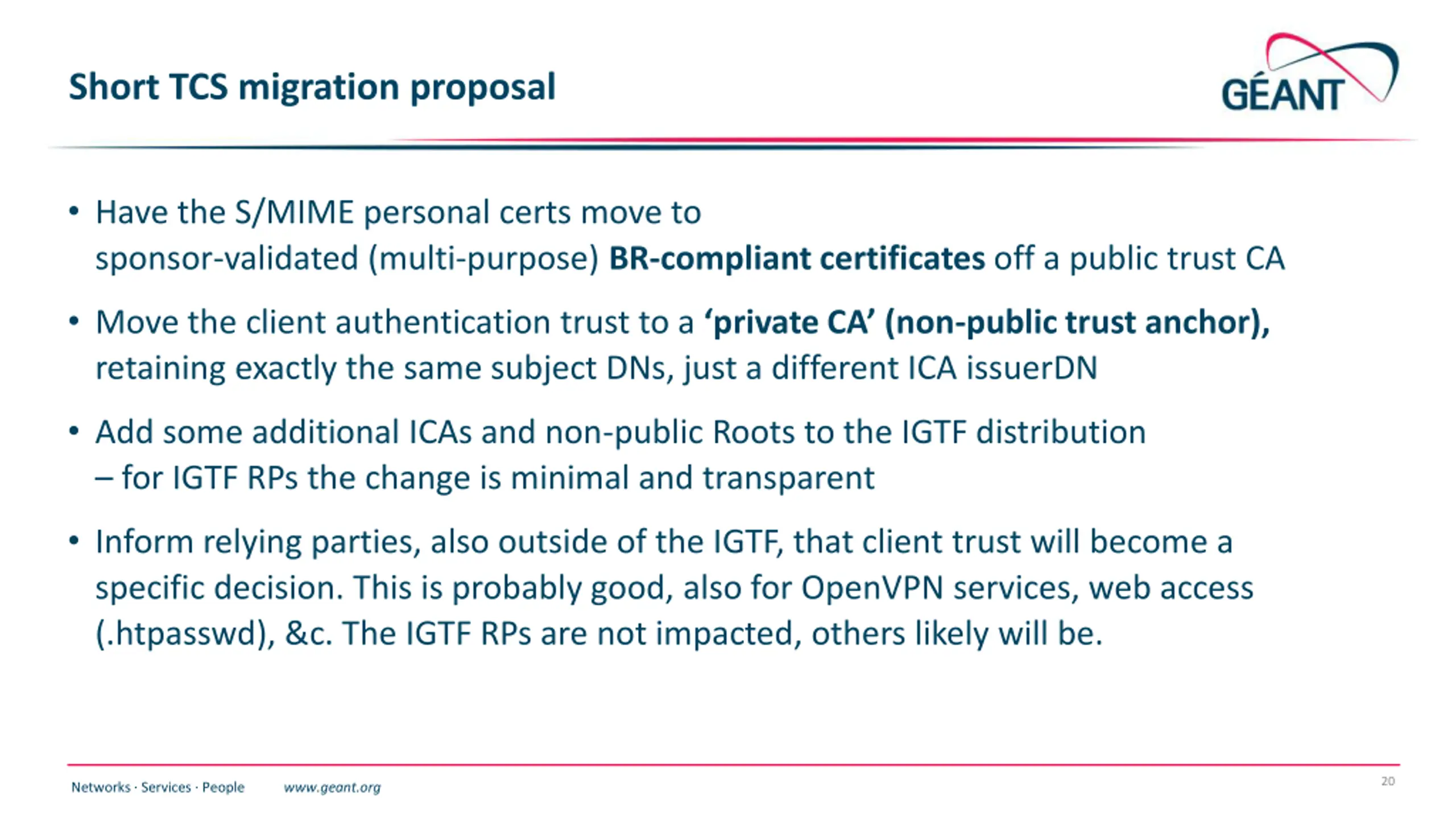 The actual proposed changes described The Personal profile currently used in TCS is UTF-8, and is excellent for email Since we want email to be served well, this profile may evolve as per the SMIME BR requirements not doing so would void the public trust and render these unusable! The IGTF variants will need to change: new hierarchy, new issuer, same subject DN format, same extensions, ASCII-only, unique naming See https://www.nikhef.nl/~davidg/tcsg4/TCS-Personal-CPS-2.2/ 19 Networks Services People www.geant.org