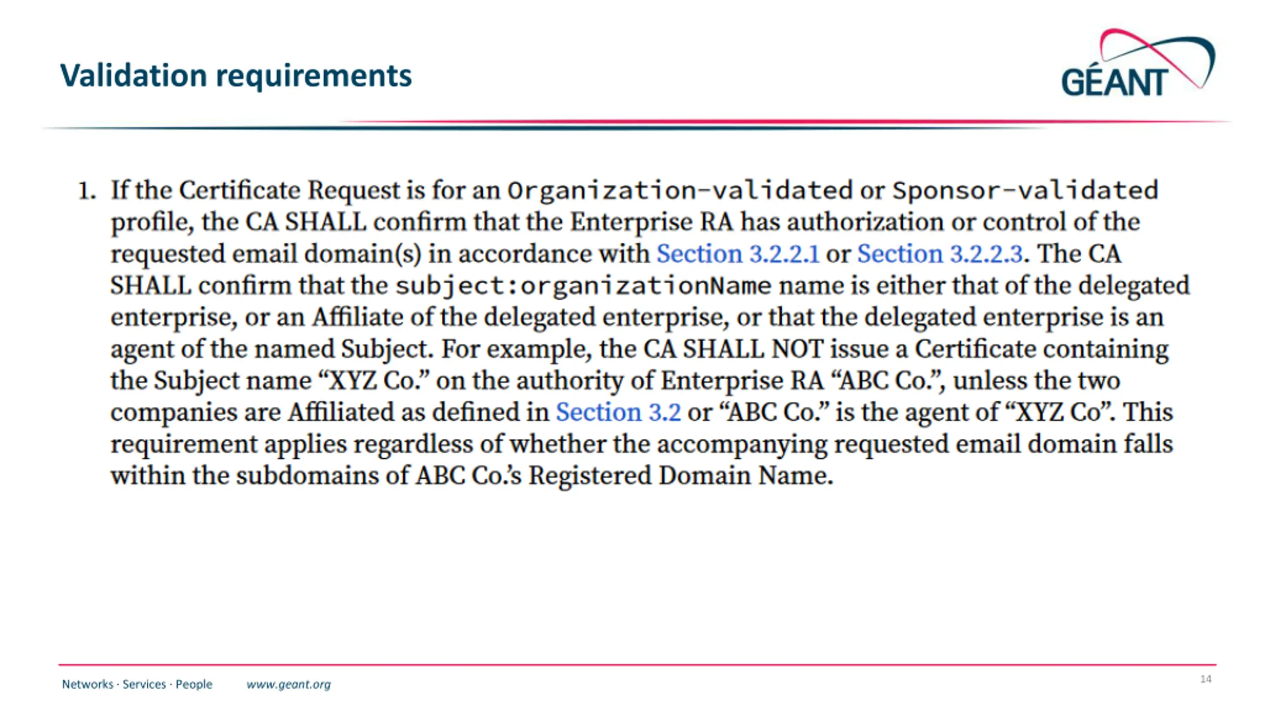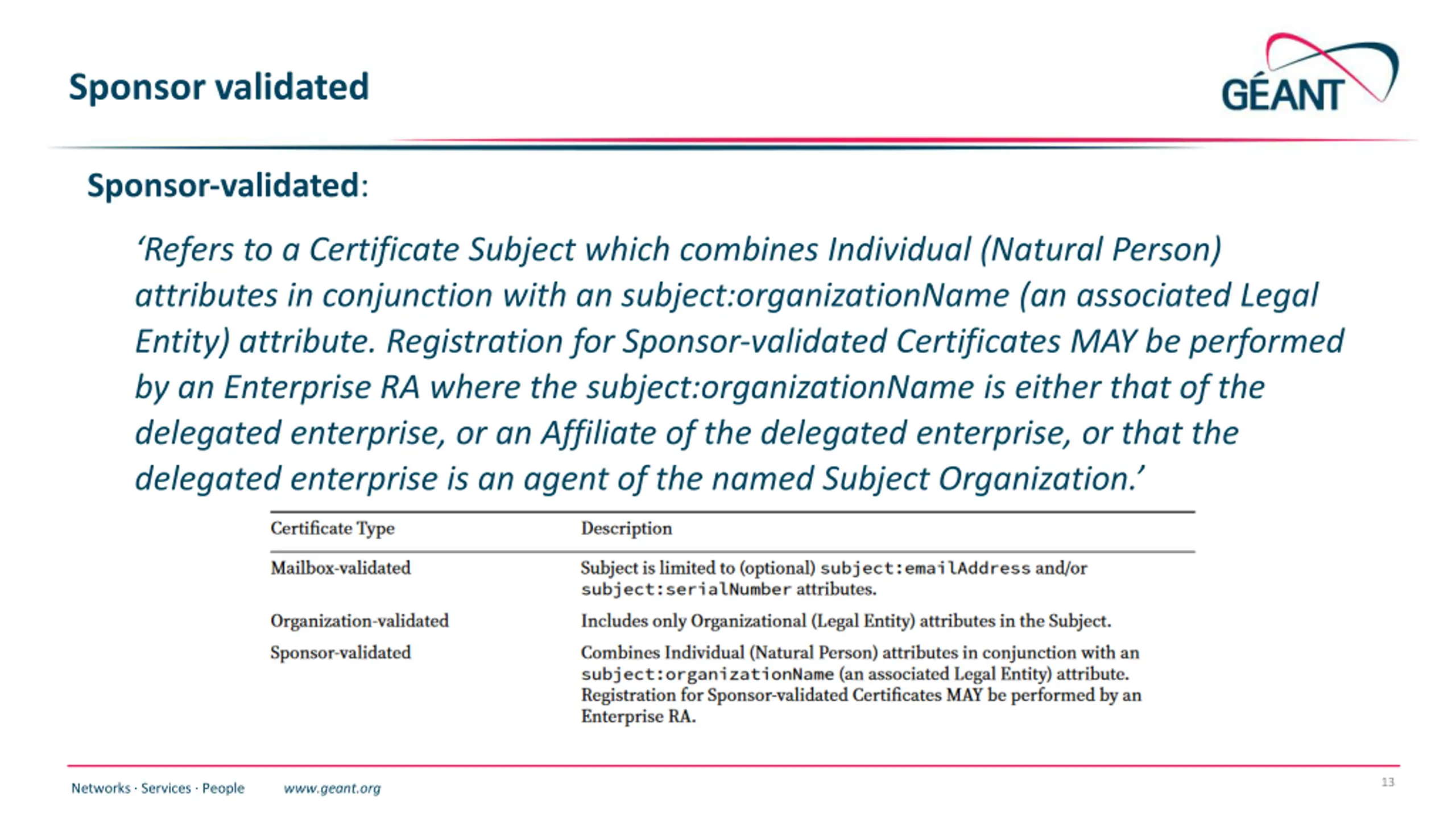 Sponsor validated Sponsor validated: Refers to a Certificate Subject which combines Individual (Natural Person) attributes in conjunction with an subject:organizationName (an associated Legal Entity) attribute. Registration for Sponsor validated Certificates MAY be performed by an Enterprise RA where the subject:organizationName is either that of the delegated enterprise, or an Affiliate of the delegated enterprise, or that the delegated enterprise is an agent of the named Subject Organization. 13 Networks Services People www.geant.org