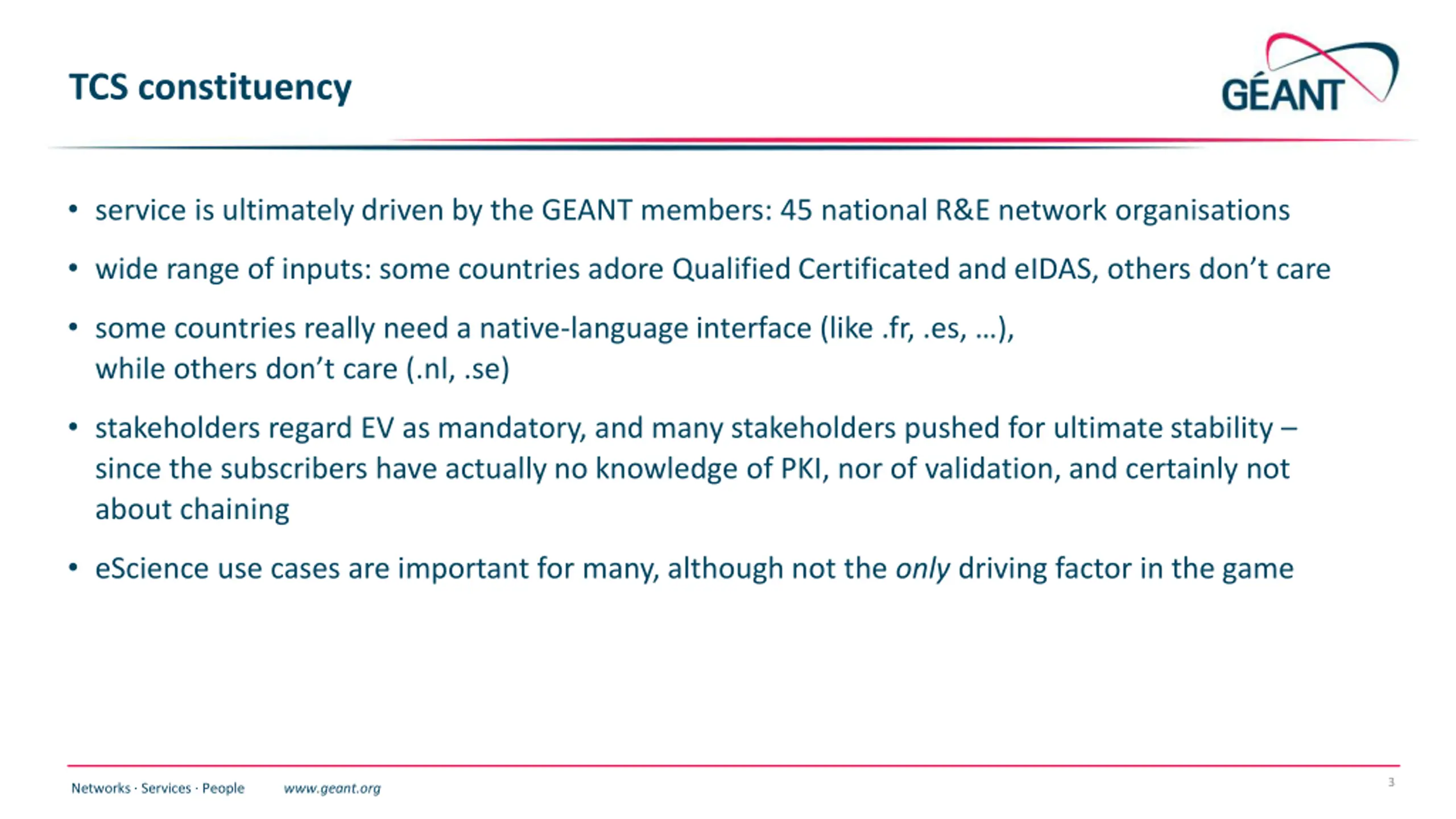 TCS constituency service is ultimately driven by the GEANT members: 45 national R&E network organisations wide range of inputs: some countries adore Qualified Certificated and eIDAS, others don t care some countries really need a native-language interface (like .fr, .es, ), while others don t care (.nl, .se) stakeholders regard EV as mandatory, and many stakeholders pushed for ultimate stability since the subscribers have actually no knowledge of PKI, nor of validation, and certainly not about chaining eScience use cases are important for many, although not the only driving factor in the game 3 Networks Services People www.geant.org