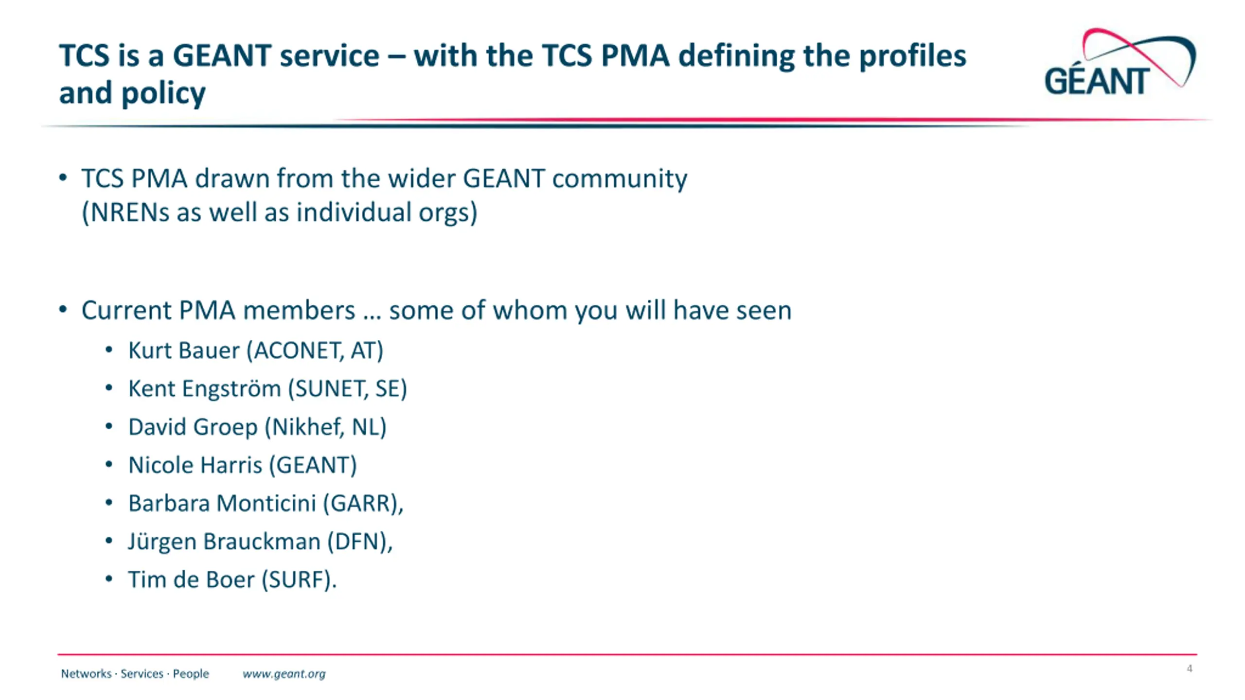 TCS is a GEANT service with the TCS PMA defining the profiles and policy TCS PMA drawn from the wider GEANT community (NRENs as well as individual orgs) Current PMA members some of whom you will have seen Kurt Bauer (ACONET, AT) Kent Engstr m (SUNET, SE) David Groep (Nikhef, NL) Nicole Harris (GEANT) Barbara Monticini (GARR), J rgen Brauckman (DFN), Tim de Boer (SURF). 4 Networks Services People www.geant.org