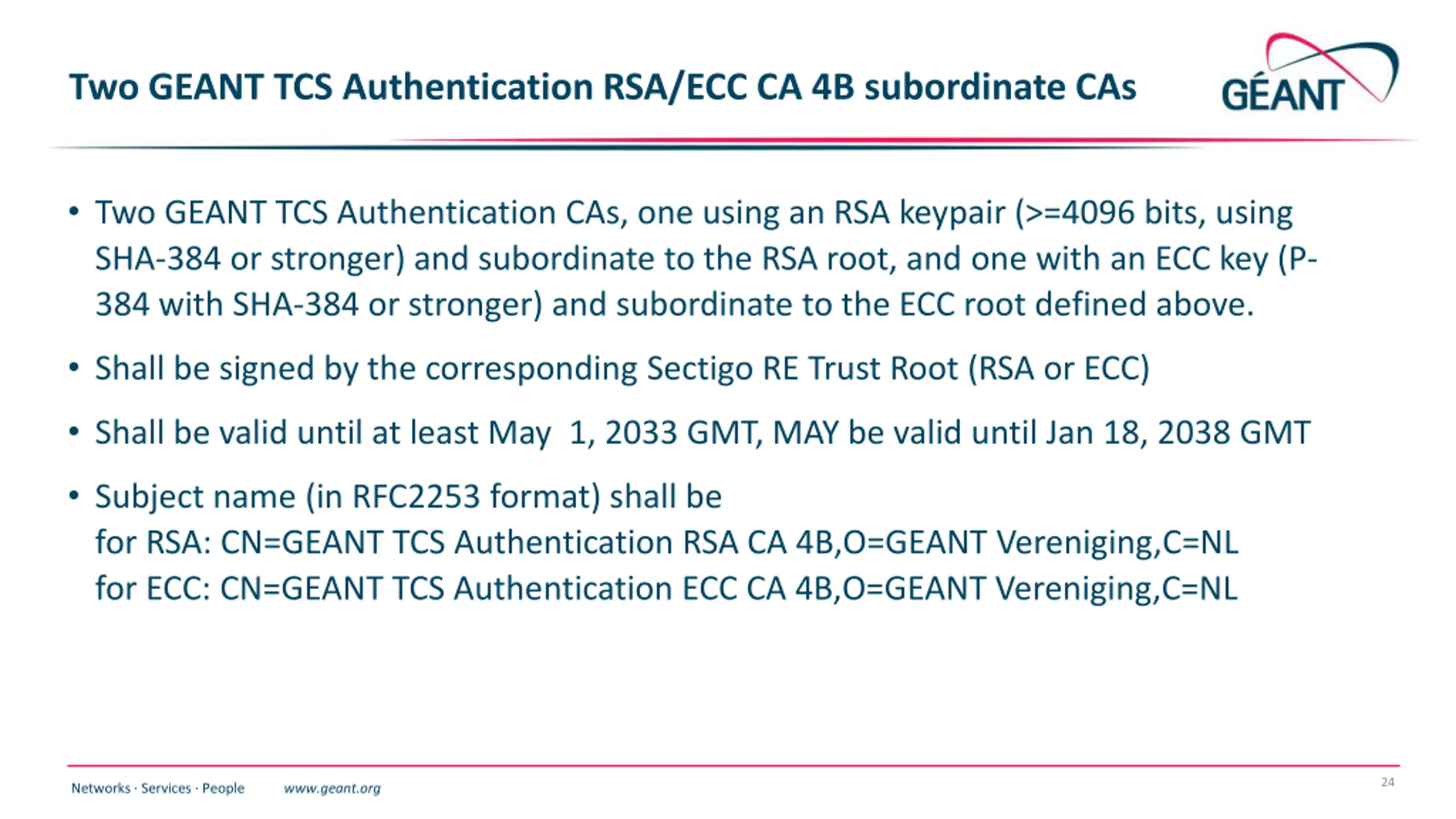 Two GEANT TCS Authentication RSA/ECC CA 4B subordinate CAs Two GEANT TCS Authentication CAs, one using an RSA keypair (>=4096 bits, using SHA-384 or stronger) and subordinate to the RSA root, and one with an ECC key (P- 384 with SHA-384 or stronger) and subordinate to the ECC root defined above. Shall be signed by the corresponding Sectigo RE Trust Root (RSA or ECC) Shall be valid until at least May 1, 2033 GMT, MAY be valid until Jan 18, 2038 GMT Subject name (in RFC2253 format) shall be for RSA: CN=GEANT TCS Authentication RSA CA 4B,O=GEANT Vereniging,C=NL for ECC: CN=GEANT TCS Authentication ECC CA 4B,O=GEANT Vereniging,C=NL 24 Networks Services People www.geant.org